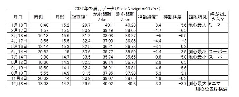 前述したとおり、2022年の満月について月までの距離、横浜から観た視直径等を以下の表に示します。