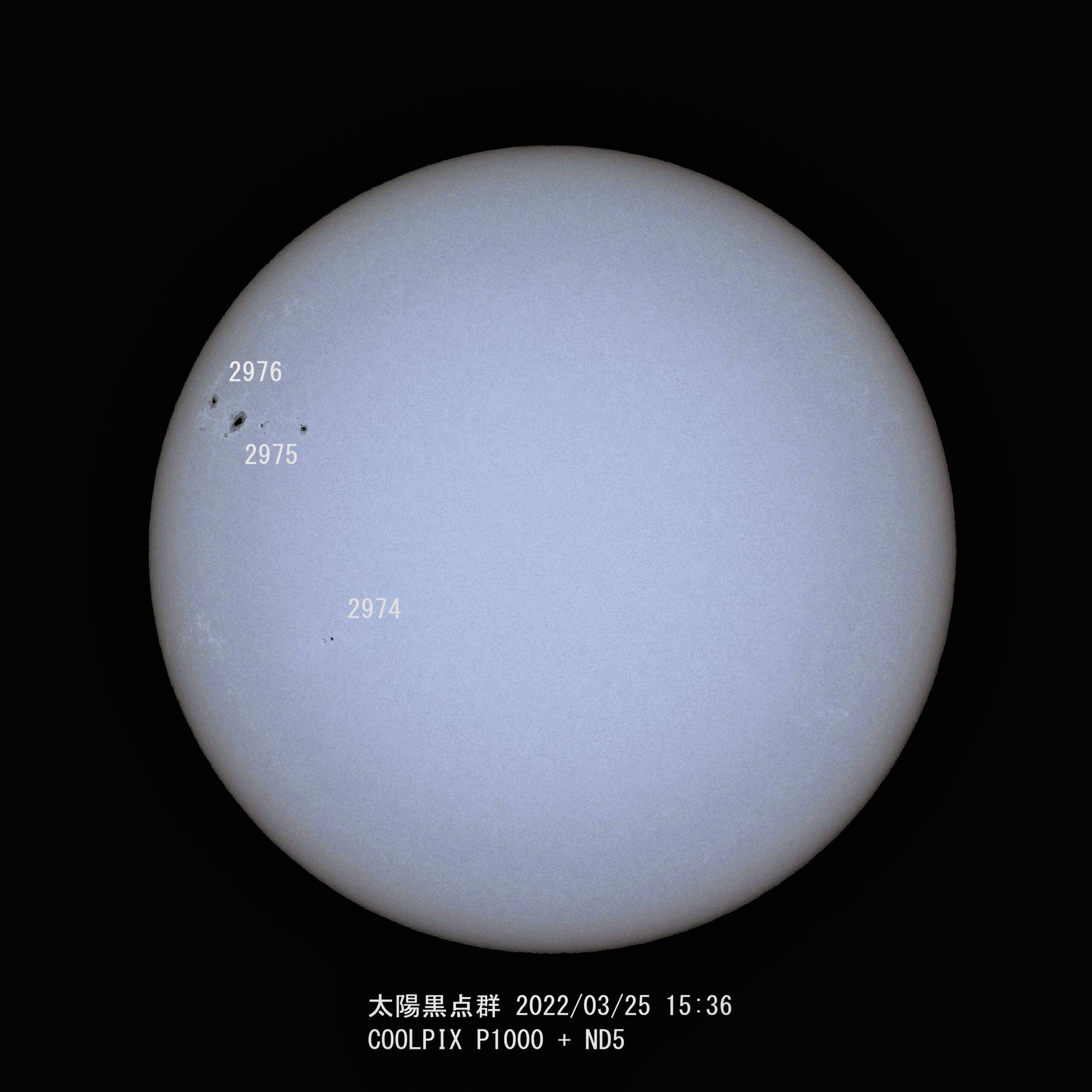 画像1 太陽黒点 2022/03/25 15:36 COOLPIX P1000 ISO-100 f/6.3 359mm(2,000mm) 1/640s ND100,000フィルター 4枚をAS!3でスタック、RS6でWavelet処理