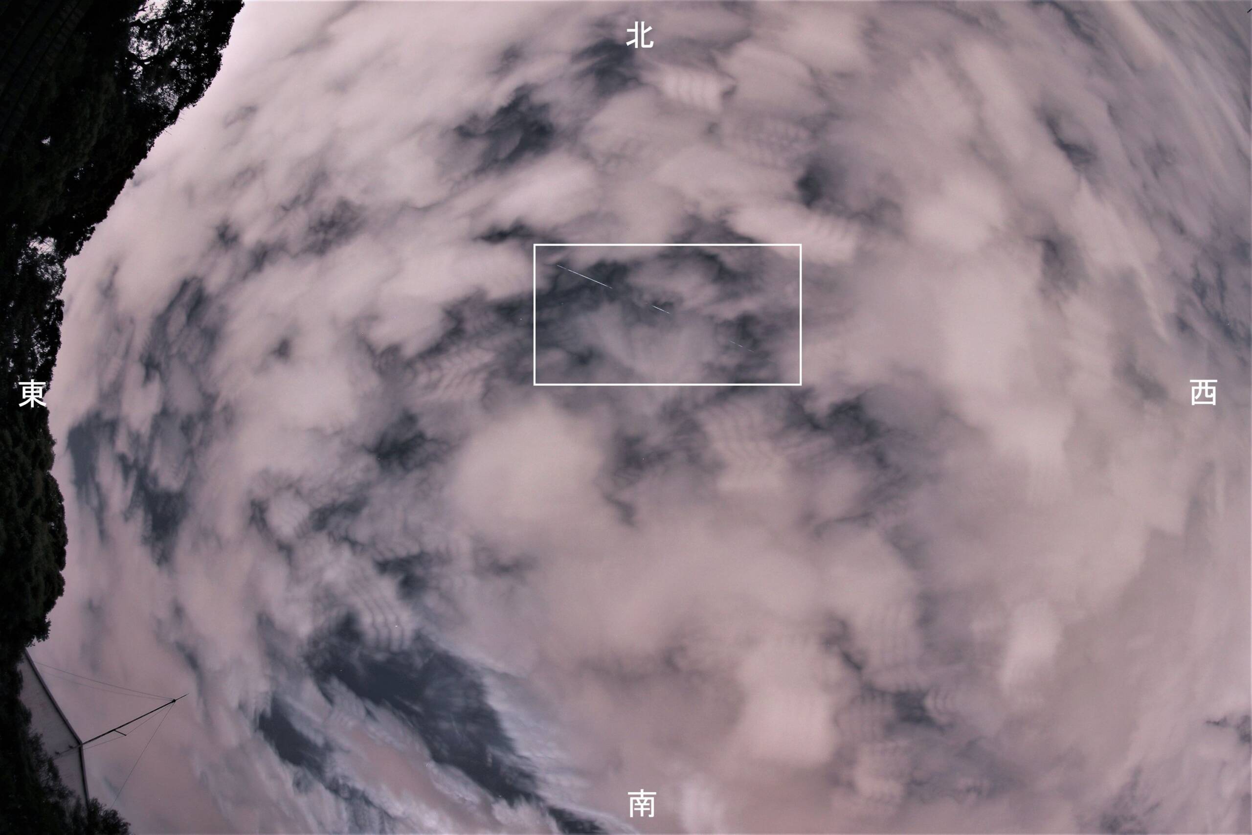 画像1に天頂に向けて撮影した光跡を。7.5mm魚眼、8秒+2秒間隔の4枚に光る線が写っていました。ご覧のとおり雲ばっかり。この通過のあと、10分くらいしたら空天頂は広く開き、残念。この後、月齢13.6撮っておきました。