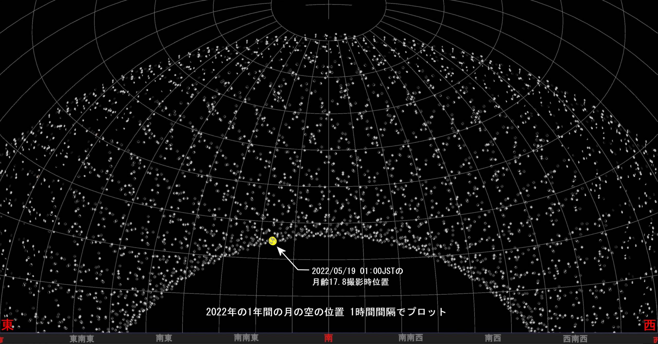画像1にいつもの焦点距離2,000mm相当の月齢17.8です。Wavelet変換していますがほぼ撮ったまま。画像2は3,000mm相当で12,000mm相当で特定の位置を撮影し貼り付けました。南の空なのにあまりに低い位置の月で濃い色の月として見えていましたので、StellaNavigator11で調べてみました。やはり一年の間で最も低く見えた月。画像3は横浜の南の空を中央にした場合の2022年の間に見える1時間間隔の月の位置を全部プロットし、その中に当日の撮影時刻の月の位置を重ねて示しました。