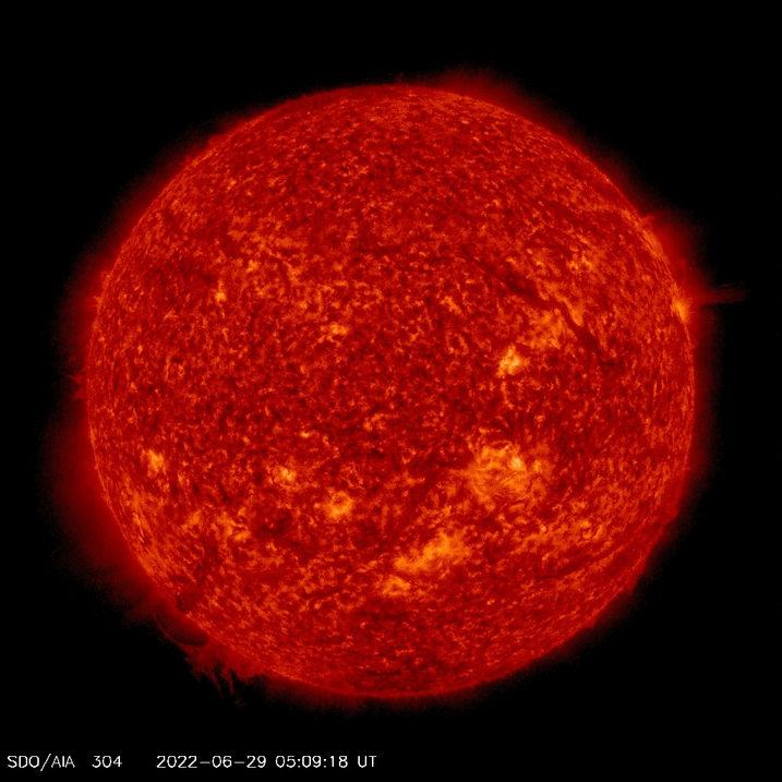 2022/06/29 05:09:18~06:08:30 UT(同日14:09:18~15:08:30 JST)間のSDO画像(AIA 304画像選択)7枚の画像をGIF画像にして以下に示します。画像はNASAのSDOページで確認できます。日時と画像波長選択の入力で見られます。全部見てしまいました。