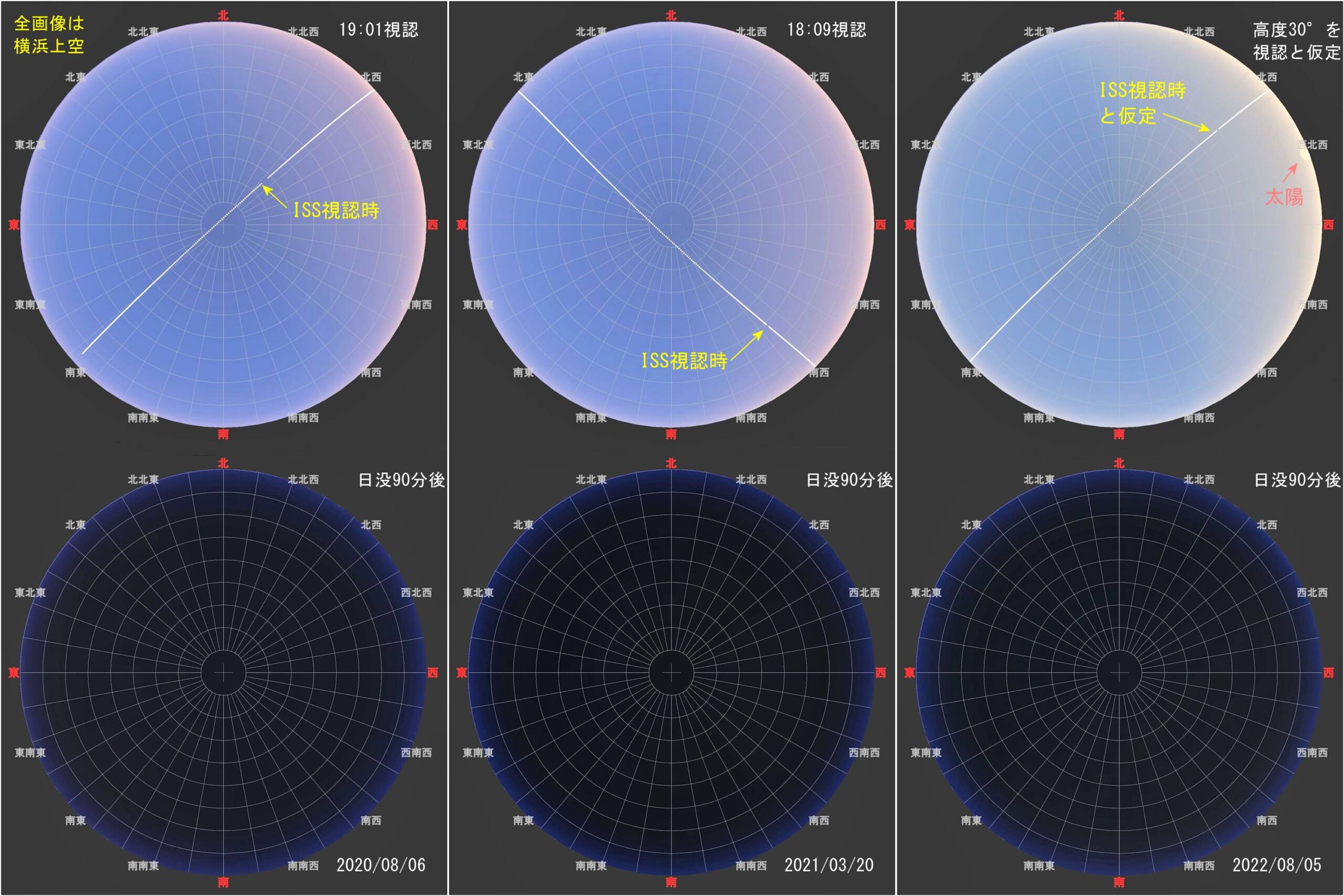 昨日の空をStellaNavigator11でシミュレーションしてみました。上記成功例の空と昨日の空で何か相違点が現れているか確認したかったのです。その結果を画像1に示します。横浜上空を前提として昼光表示指定にし描画したものです。ISSの明るさは意図的に強くして表示されるようにしています。上段は上記撮影開始時刻を視認できたと仮定した時点の空の明るさの状態、下段は日没後90分後の空です。右端の昨日の空は挑戦も出来ませんでしたが、もし高度30°で視認できたと仮定した場合の画像で、太陽がまだ地平線にあります。