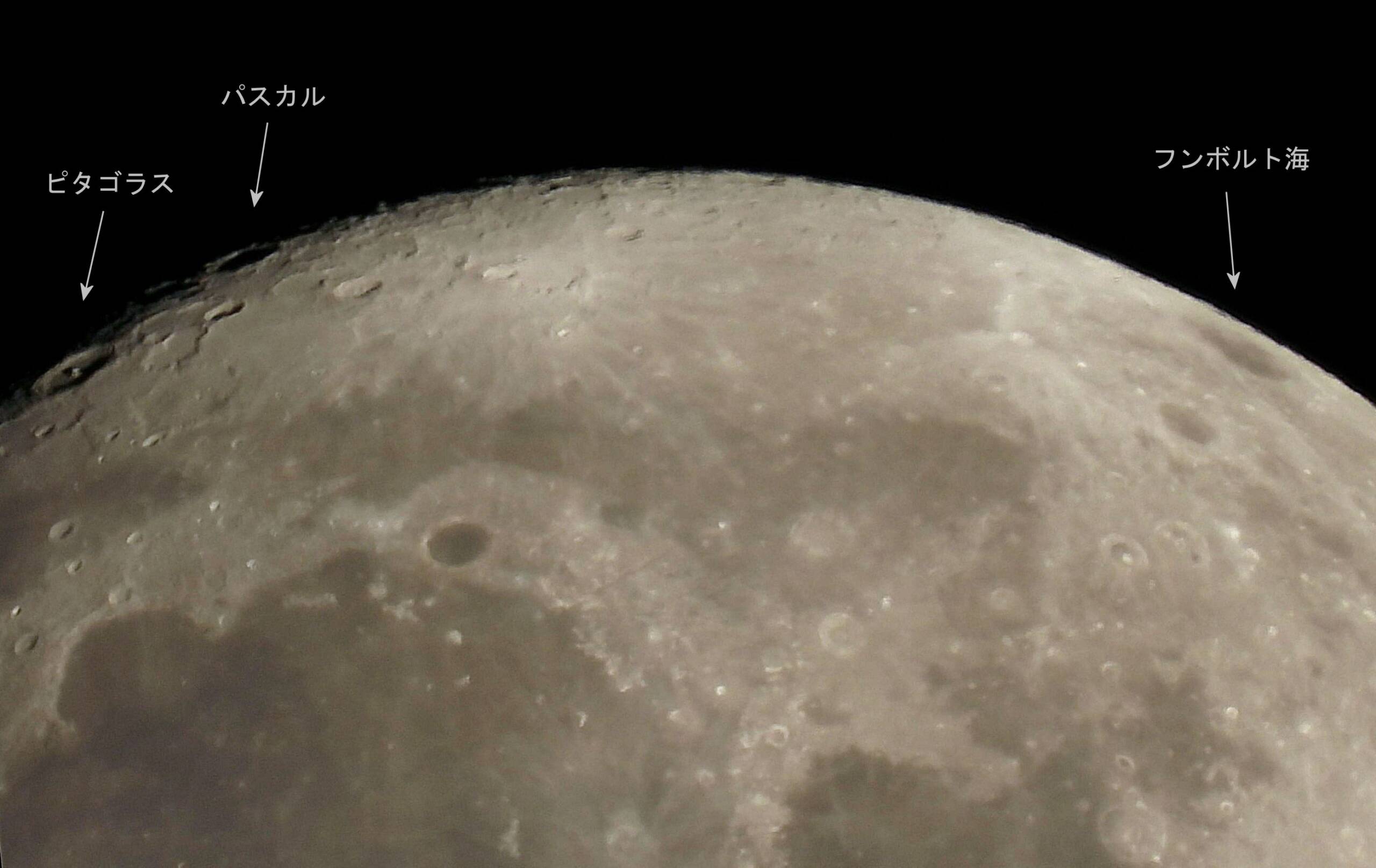 拡大して、その北側部分を観察。右にはフンボルト海は少し面積を広げて見せてくれています。左側は満月ではありませんので陰との境界になってしまいますが、少年少女で習うピタゴラスとパスカルの名称のクレーターが見えました。パスカルは月のリム(外側枠)にかなり近いです。08/11と08/12はさらに月の顔は下に向きますから、両クレーターは陽当たりが良くなりもっと観測が楽しめます。