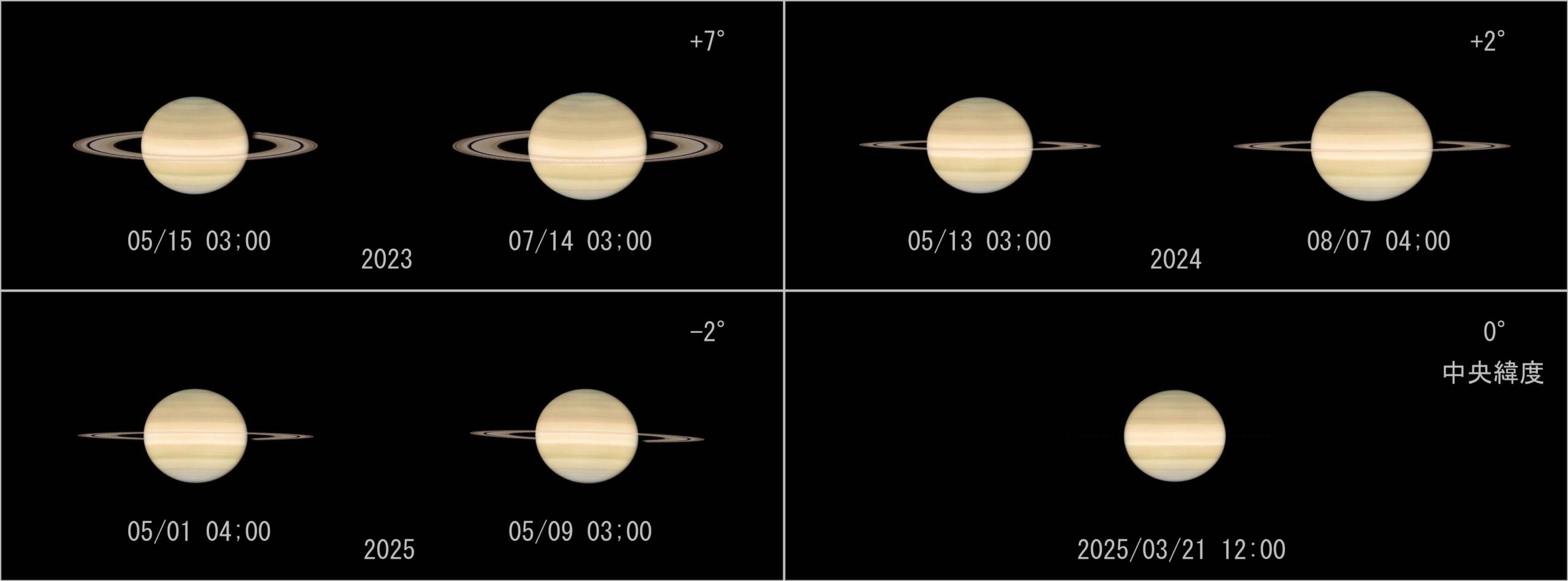 ここでは、ベストな年月日を示せませんが、環が最も狭く見える時期を幅を持たせて選択することにしました。各年で環が最も狭く、細くなる条件として中央緯度が最も小さくなる日時(+の場合は北側から、-の場合は南側から環を見る。0度は真横で見えなくなります)、またその時に夜の部(土星本体が撮影できること)であることとしました。その候補を並べて画像2に示します。