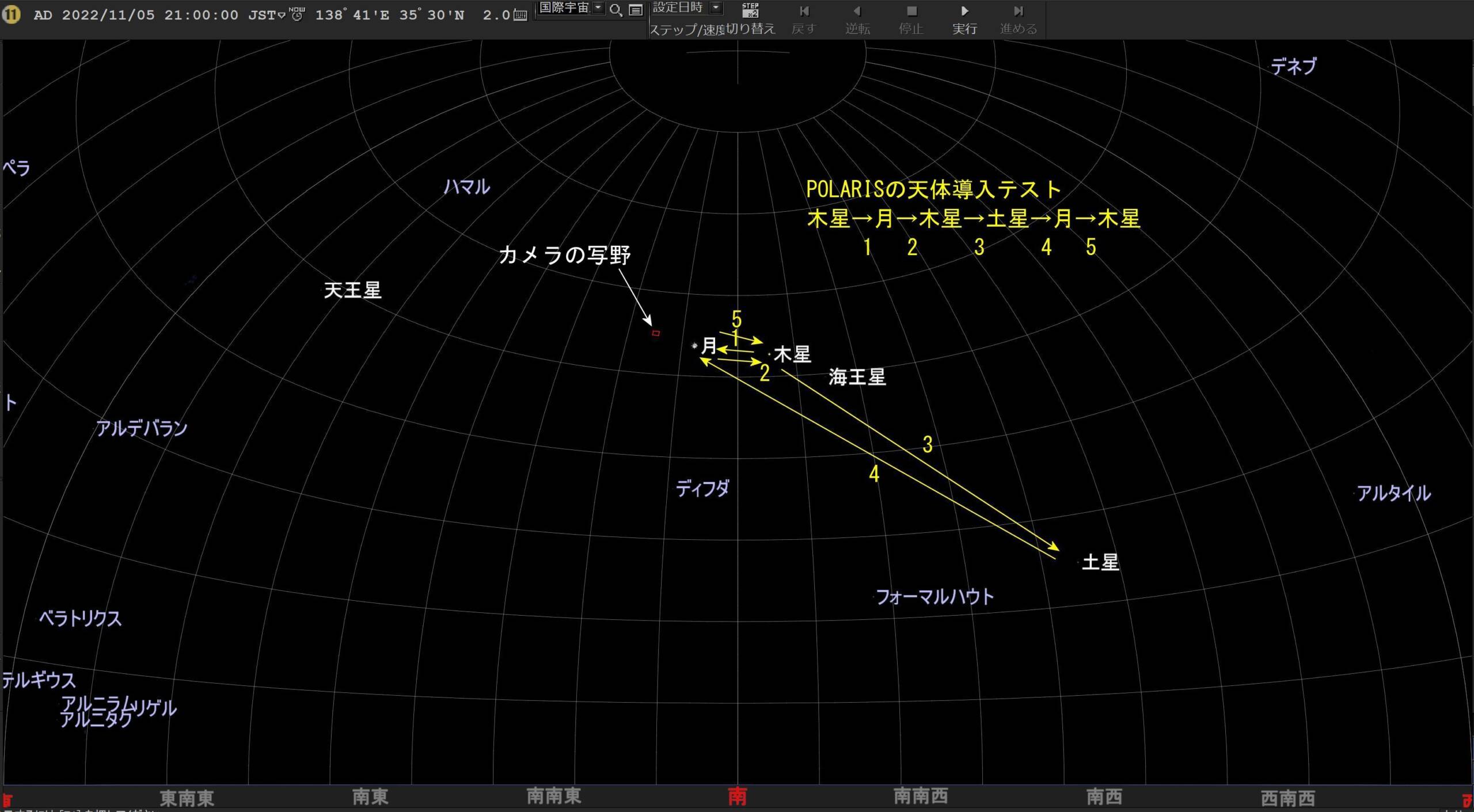 図1に今回テストした導入ステップの順をステラナビゲータ11の星空で示します。そのステップで4K動画で105秒間連続で撮影。ここではファイル容量から縮小しかつ再生速度を約5倍速、20秒間の映像に縮めて動画1に示します。土星の導入が少しずれたように思いましたが焦点距離3,000mmですので個人的にはその程度かと。なお、POLARISはGoTo機能により目標天体導入直後はわずかな時間ですが天体を追尾していません(動画1でも導入直後の天体がトレイルしているのがわかります)。目標天体導入後、数秒で右上に一度大きくずれて(調整?)写野から消えますがすぐ戻り問題ありません。この理由は三軸のギアバックラッシュとの関係、追尾直前の天体座標の補正とか想像しましたが理解できていません(BENROに確認要 → 先日丁寧な回答があり一般的な問題解決のお話ですのでそのまま載せておきます。個人的には予想通り、ギアバックラッシュの回避策でありBENROは精度を高めているという解釈です。There is a reduction device inside Polaris motor, and there is backlash inside the transmission gear. Because of this, in the one-way drive process, when the input shaft began to reverse, and the output shaft to follow the reverse, there will be lag of the output shaft in the corner. Then the movement is to ensure that when moving and tracking, the motor drive direction is the same direction. 2022/11/17追記)。