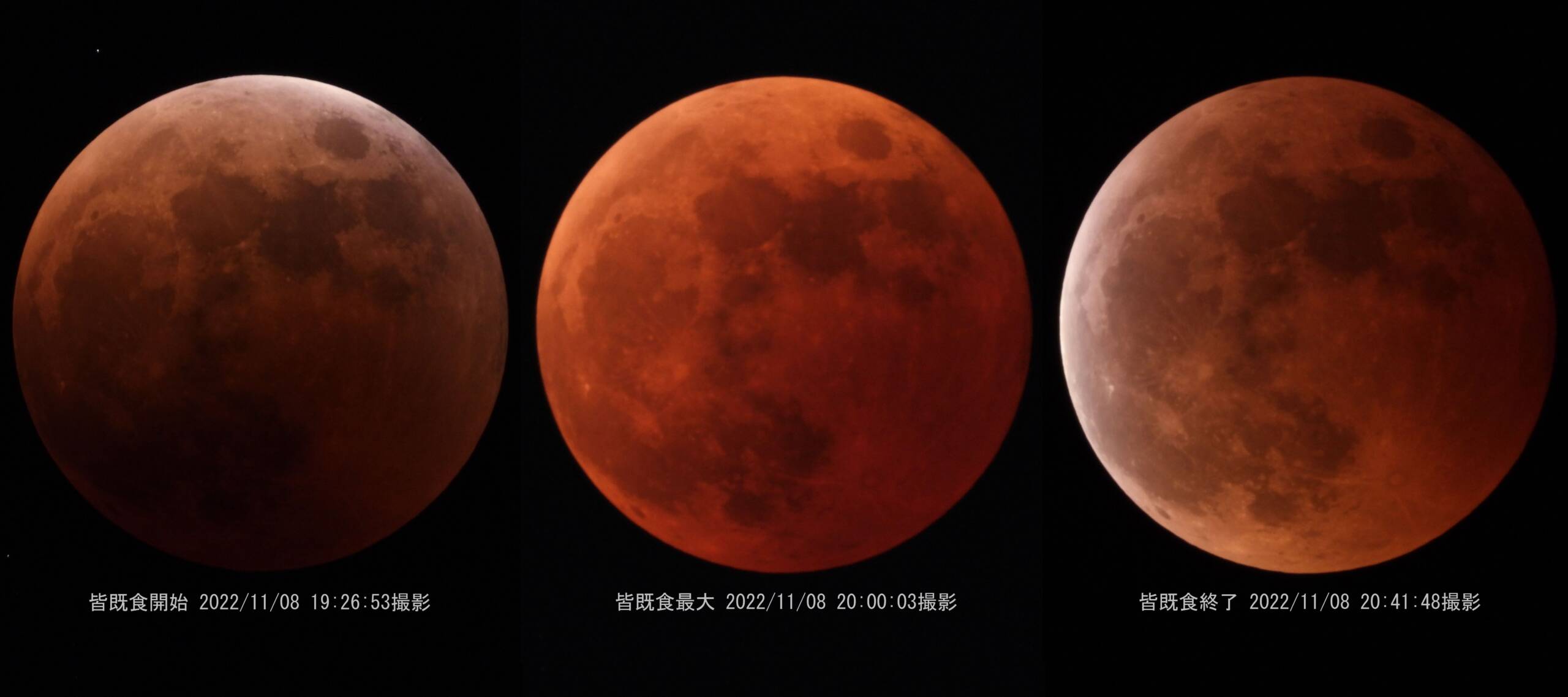 画像4 皆既月食2022/11/08の皆既食開始、最大(地球の影の中心に最も近い)、皆既食終了時の画像 COOLPIX P1000