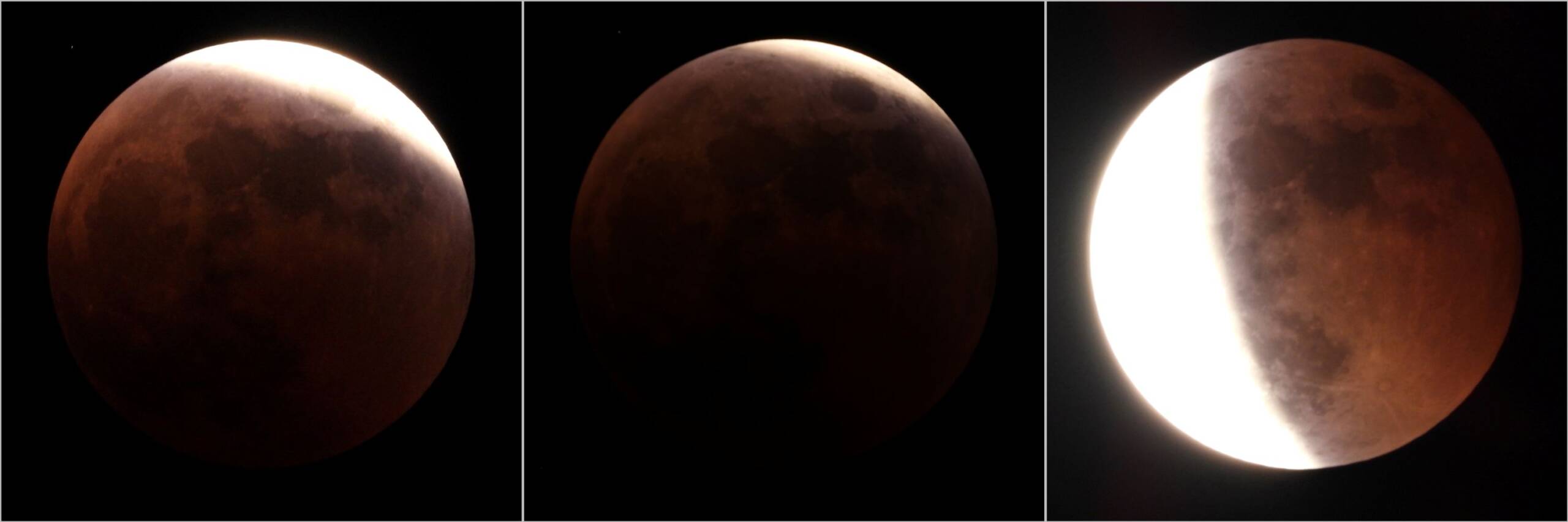 皆既開始時、皆既最大および皆既終了時点の画像(上記に示した時刻とは少しずれます)を画像4に示します。月食時の色合いは眼視では赤黒い印象です。月の海がどうしても暗めになります。それでもカメラは明るく撮ろうとするほど鮮やかになります。三枚の内、中央の皆既食最大時のシャッター速度が4秒、他は2秒です。それ以外は共通でISO-400 f/6.3 359mm(2,000mm相当)。皆既食最大時のみやや暗く処理しています。他は原画(トリミングのみ)のままです。
