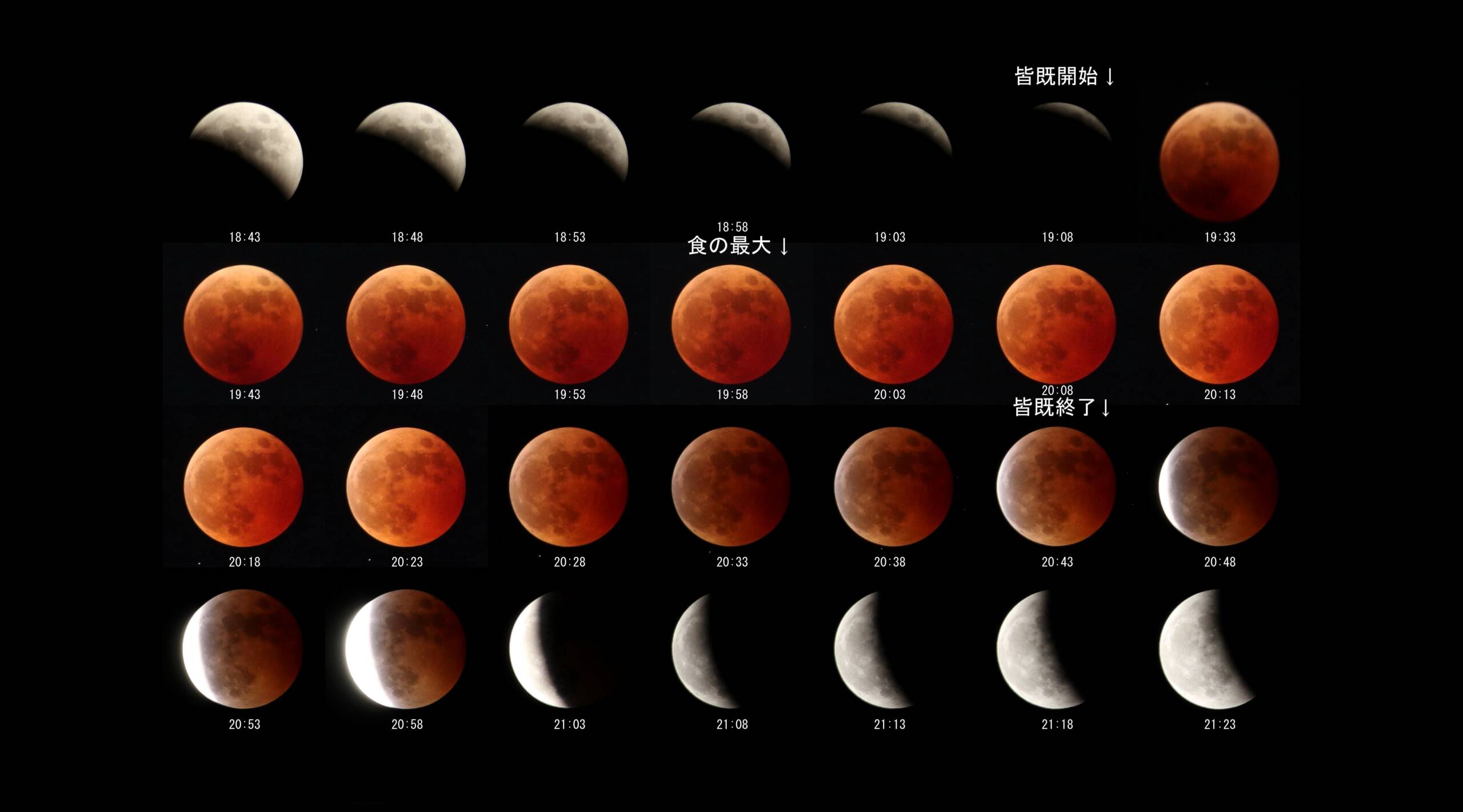 画像1に月食の経過を示します。本影は既に始まっていて、皆既食開始、食最大、皆既終了を撮影したものです。