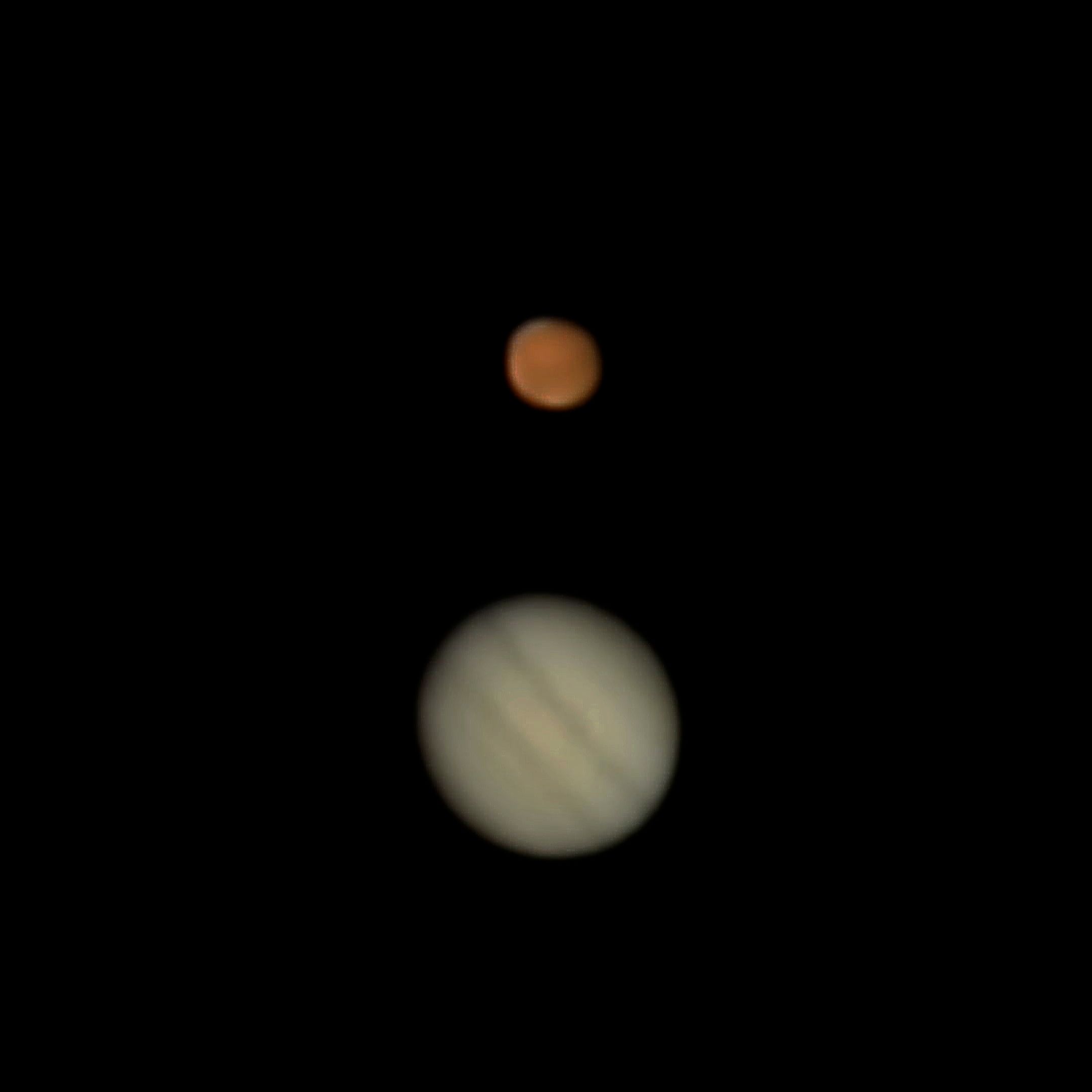 画像3に火星と木星の2枚を縦に並べて合成しました。どちらも2倍に拡大しています。この日この時間帯、火星の表面は大シルチスとヘラス台地がわかりますね。写せたので連勝です。