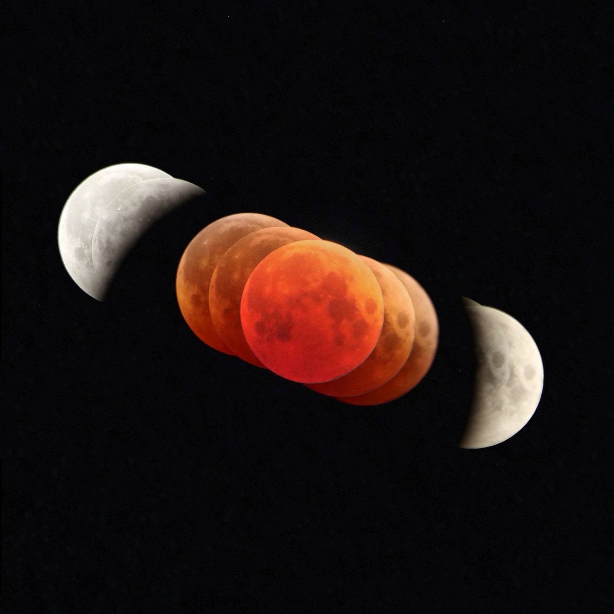 画像1 皆既月食と地球の影 2022/11/08 時間経過としては右側から左へ18:43~21:23 EOS-M6 200mm 月を該当配置後比較明処理 中央の月はほぼ皆既食最大