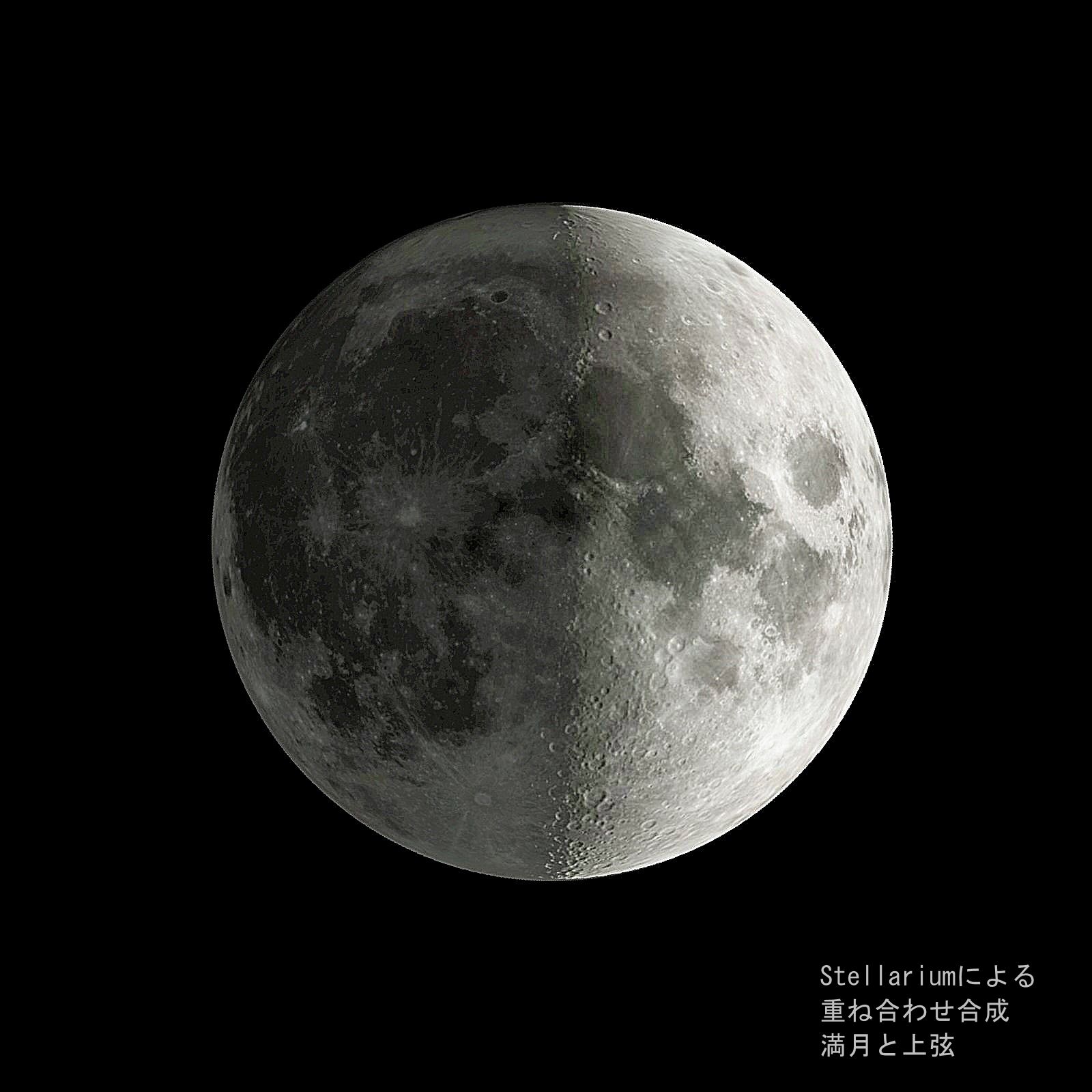 画像1 満月(今年の中秋の名月)と今月末の上弦の月の組み合わせ合成画像 それぞれStellariumの画像を利用