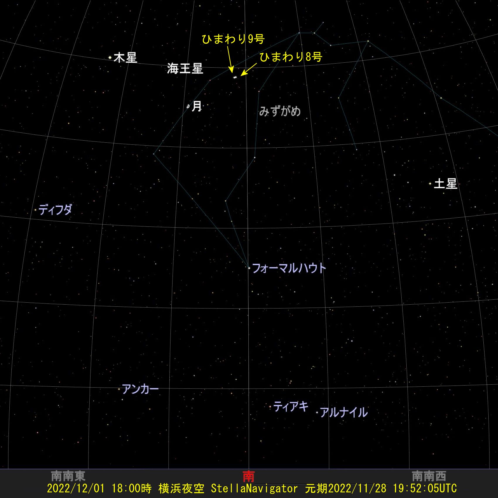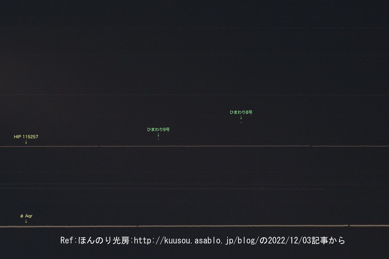 実写像の衛星ひまわりと恒星HIP 115257、みずがめ座Φ Aqrの位置関係から観察位置を変更するなどStellariumでサーベイすると2022/12/02 日没後1時間半後に撮影されたものと推定されます。参考に画像6にGIFファイルで示します。18:04から1分間隔で18:18までの変化です。実写像は連続露光になりますので恒星は直線になります。ひまわりは静止衛星ですのでがっちりと身動きせず。