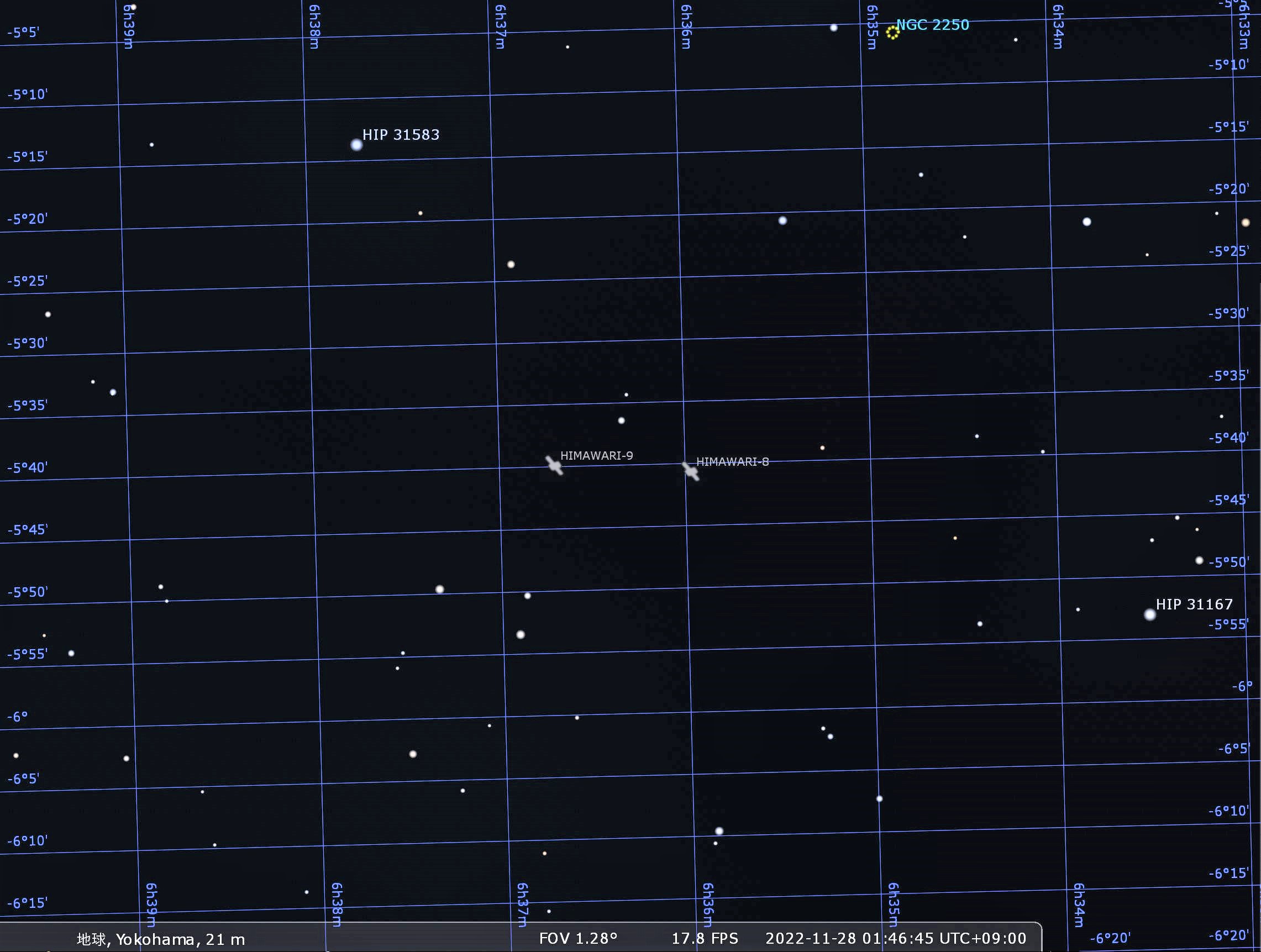 ひまわり8号および9号の位置を一つの例として画像3に示します。2022/12/01 18:00時点の横浜の上空です。静止衛星ですので衛星以外の天体全部が自転により変わりますので注意。ひまわりの光点は明るく表示しています。