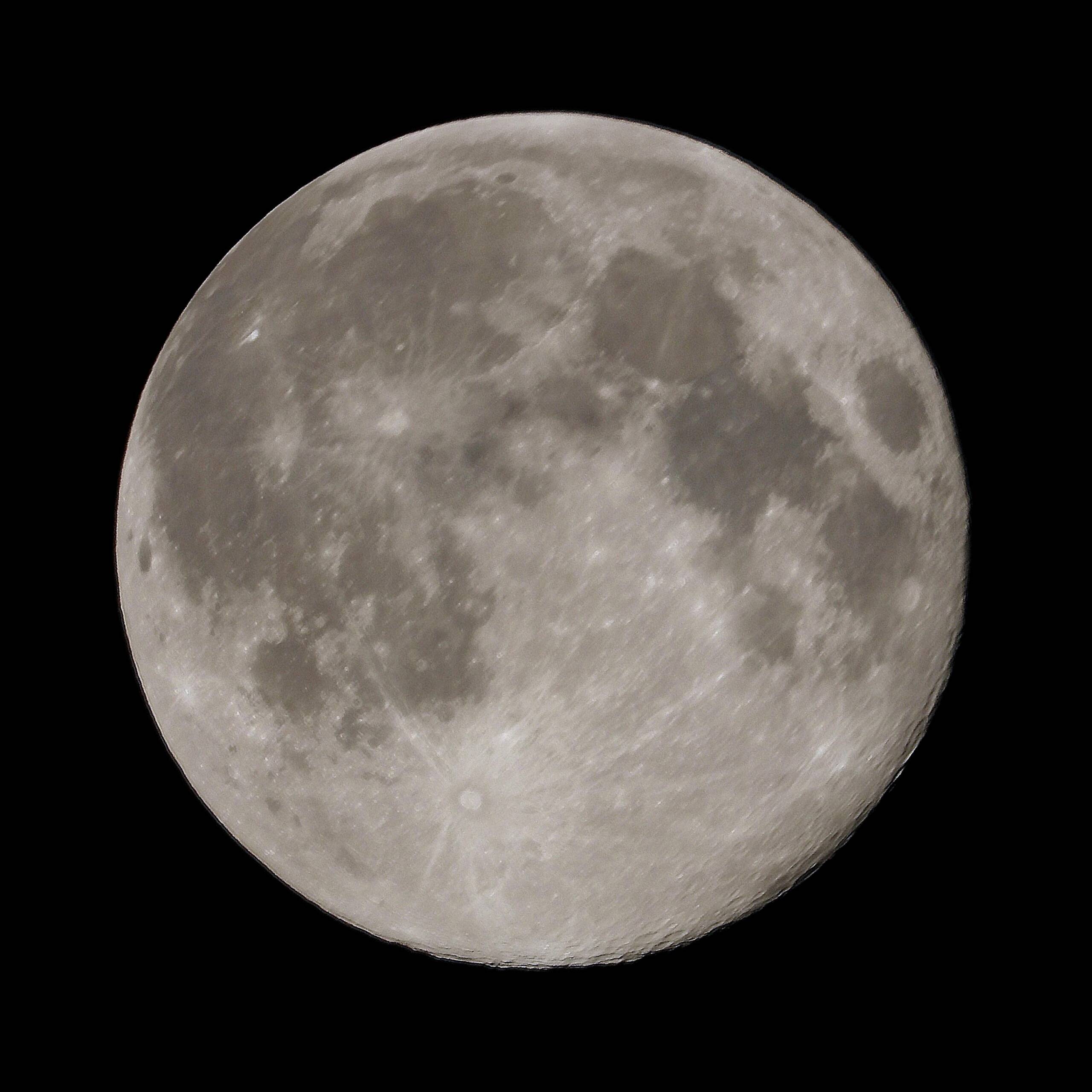 当日は高度30°近くで、満月の輪郭が上下左右、交互にゴムまり状態のようなゆがみを繰り返し、しかも月面はジリジリ、チカチカしていて不安定でした。落ち着くのを待ち、緩やかになった瞬間の3枚をAutoStakkert!3でスタックし、RegiStax6でWavelet処理しました。画像1に示します。4K映像の数ファイルも撮ったのですが全てスタック画像もフレーム画像もまともに写っていませんでした。満月時刻を少し過ぎたので右側がほんの少し欠け始めています。上記春の上弦の撮影を期待します。