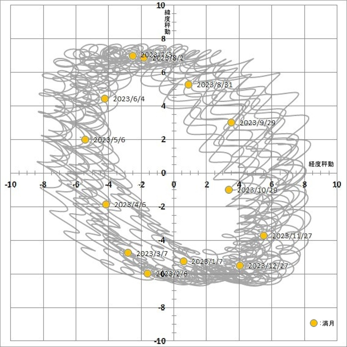 2023年の月の秤動を自身でも確認しました。図1および図2に地心秤動と測心(横浜)秤動の年間連続変化を示します。地心秤動の図は天文年鑑2023の12か月分の図を重ね合わせた図と同じになります。横軸が経度秤動、縦軸が緯度秤動を示します。図中には表1の満月の位置も示しています。