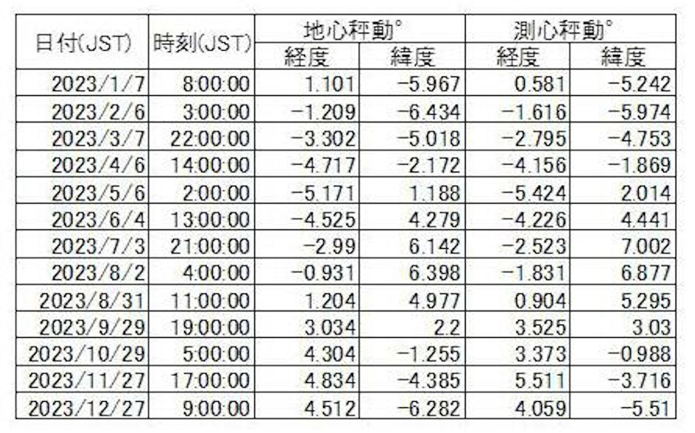表1 2023年満月の秤動 測心秤動は横浜地点 時刻は30分前後を近い方のhourへ