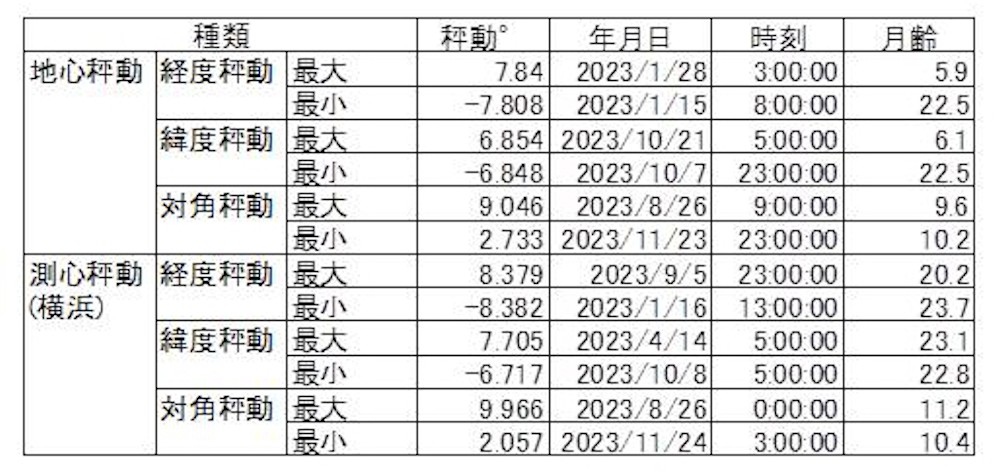 表2 2023年の月の秤動(秤動経度、秤動緯度)の最大値、最小値等 時刻は30分前後を近い方のhourへ