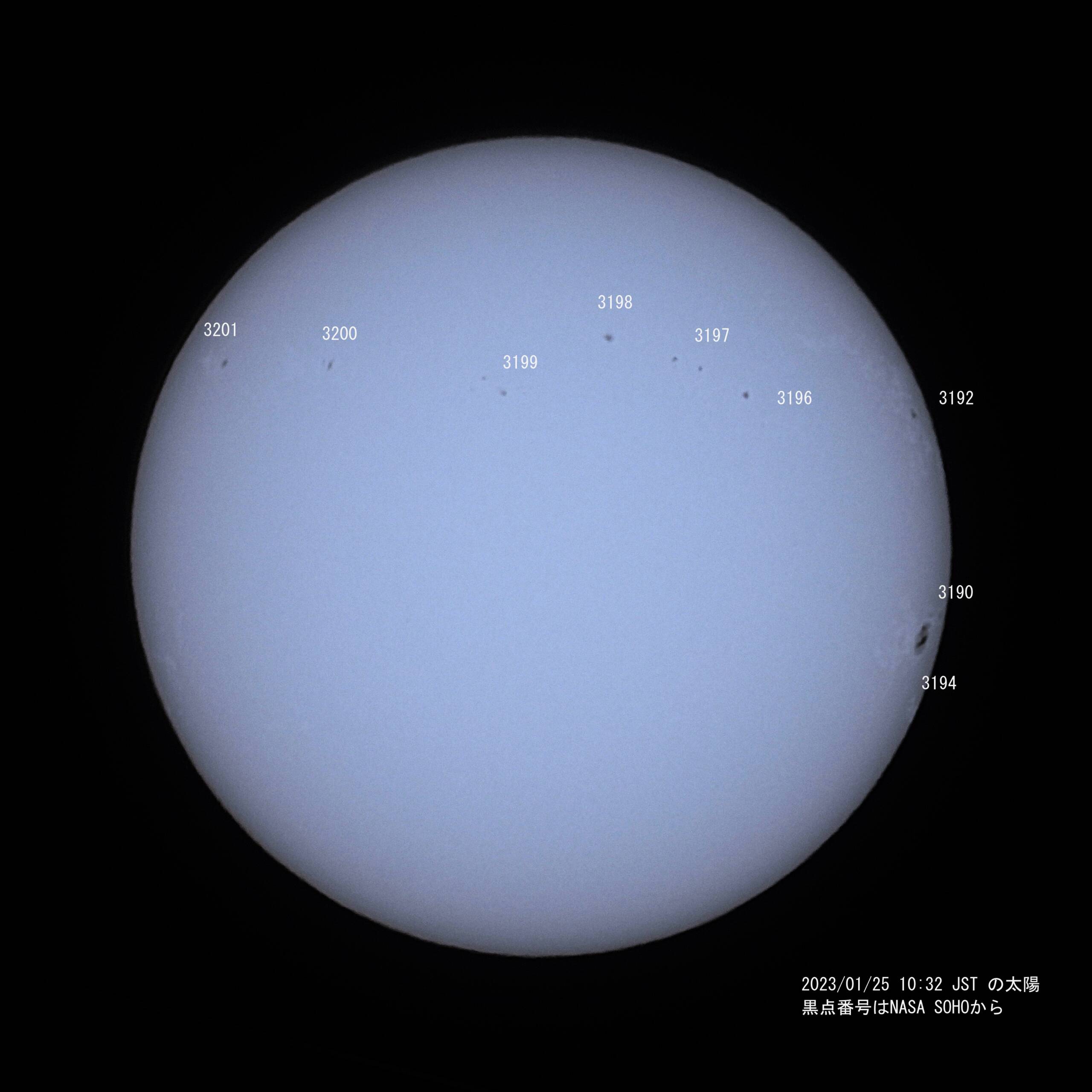 太陽中央に見えていた大きな黒点#3190(No.1124)が5日間経過して右端に。白斑が少し目立つようになって太陽面らしく感じます、#3194は黒点というより白斑しか見えません。寒くてとても外に出て撮る気にはなれませんので部屋から。5枚のスタック画像。