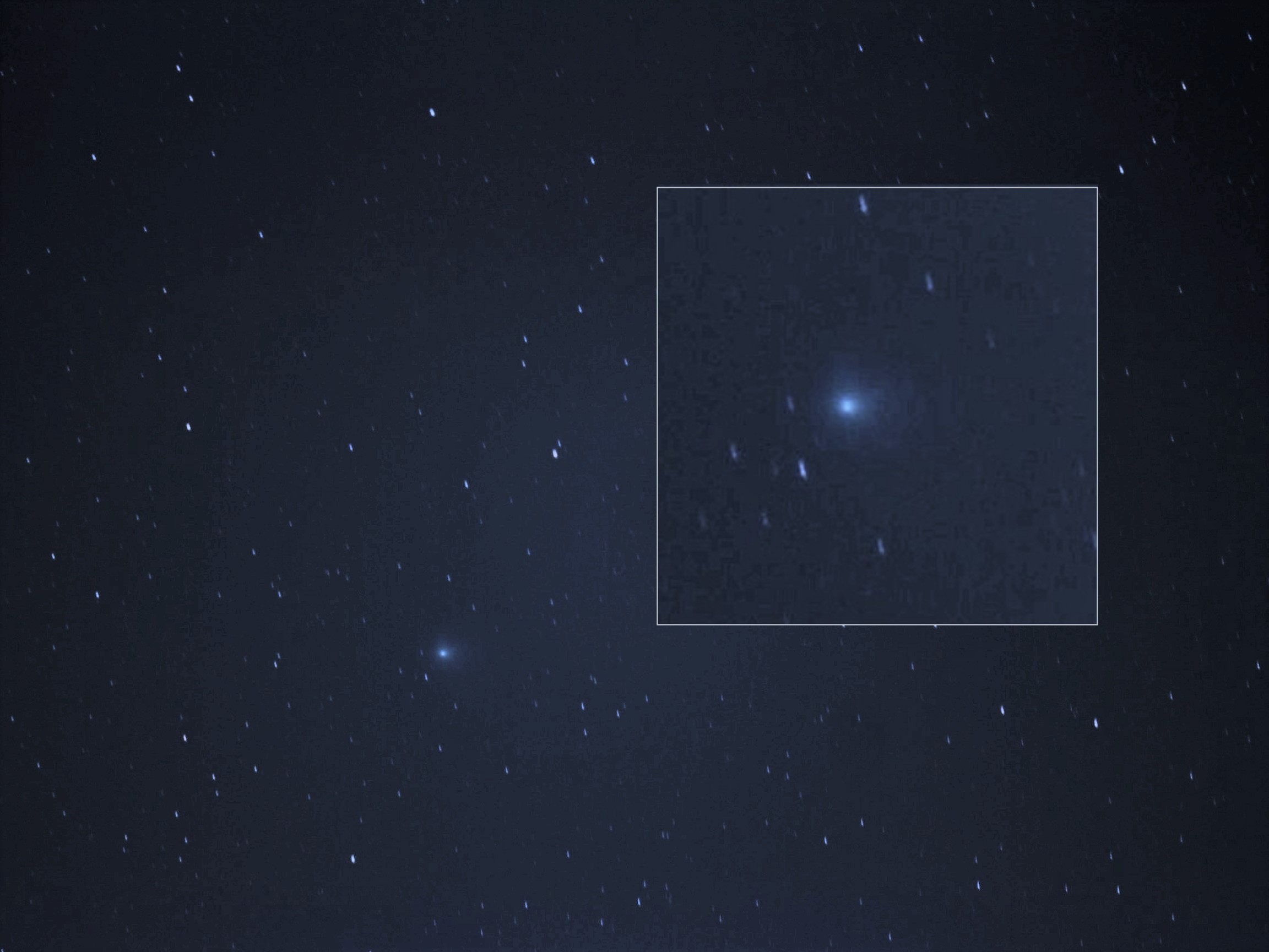 アライメント調整後、目標天体ZTFの座標をiOSアプリのStellariumで検索、メモして(一度に覚えられる方は必要はありません。Ra/Decですので、両方を一度に入力しないとアプリ間の切り替えの際に消えてしまいます。これは開発チームへの要望の一つになるかも知れません)それを入力しZTFへGoTo。カメラモニターでもアプリPolarisでも彗星は見えませんので一度試写。見事に焦点距離200mm(320mm相当)の画角内のほぼセンターに入っていることを確認しフレーム枠を決定。ISO感度、シャッター速度、F値、WB、撮影枚数とインターバルを設定後、シャッターボタンをスクロールして撮影開始。
