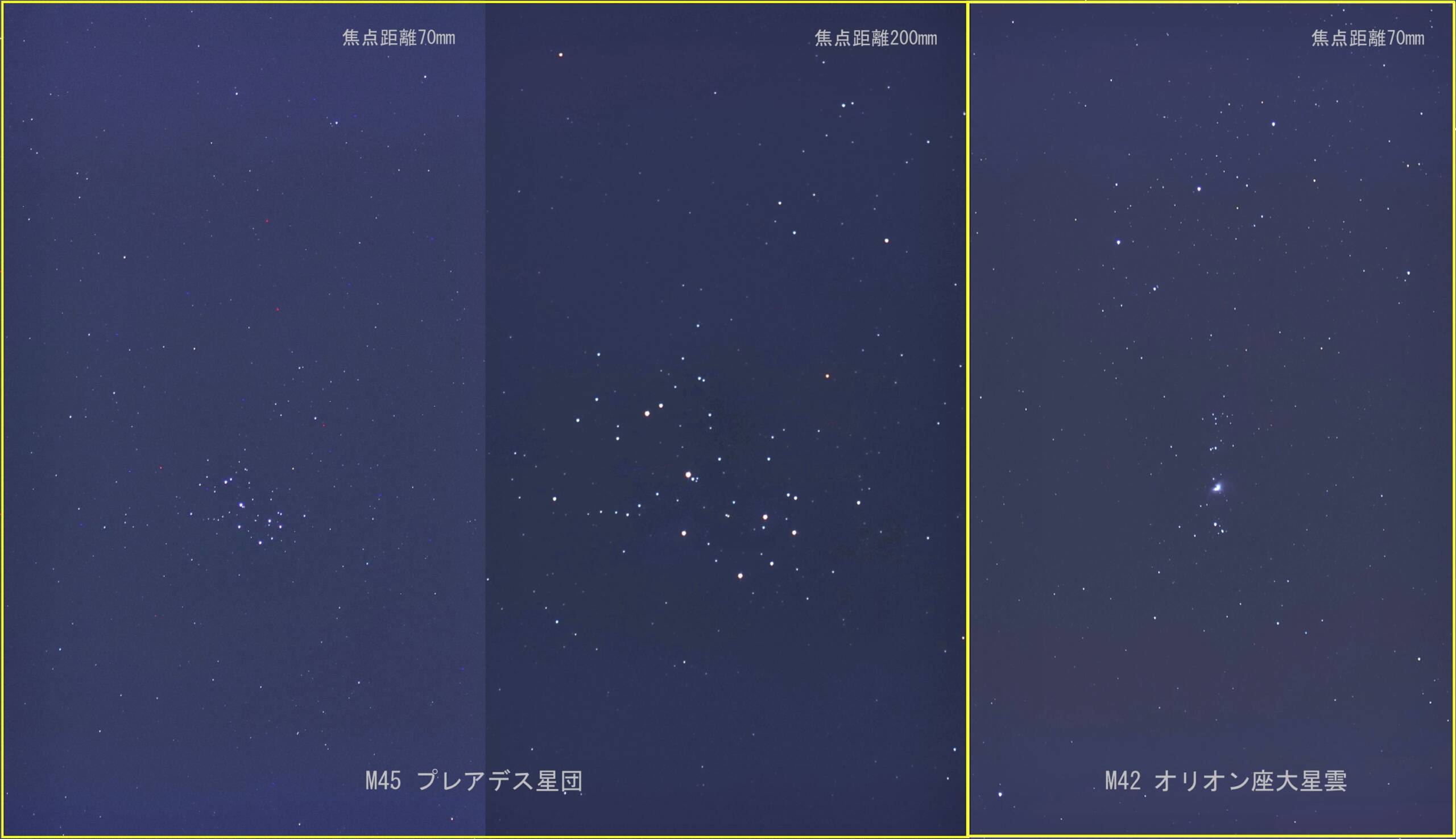 M42およびM45を画像1に示します。M45プレアデス星団は若い天体、そのかたまりに目がいきます。70mm(112mm相当:シングル)と200mm(320mm相当:10枚のスタック画像)で撮影。星間ガスは空の明るさで写すことはできませんが、都会でも月のない暗めの空だと写ることがあります。M42は70mm(112mm相当:10枚をスタック)で撮影。