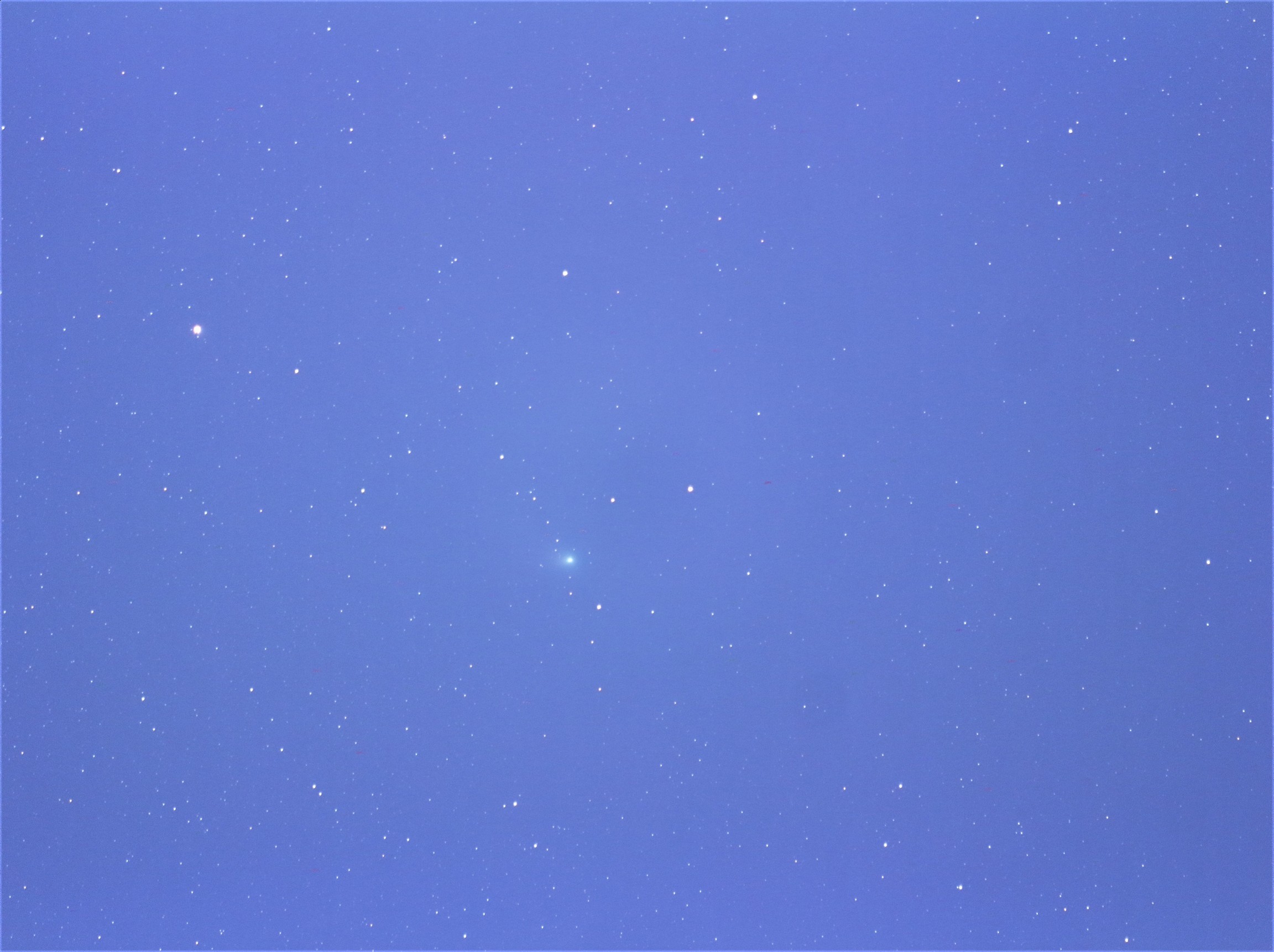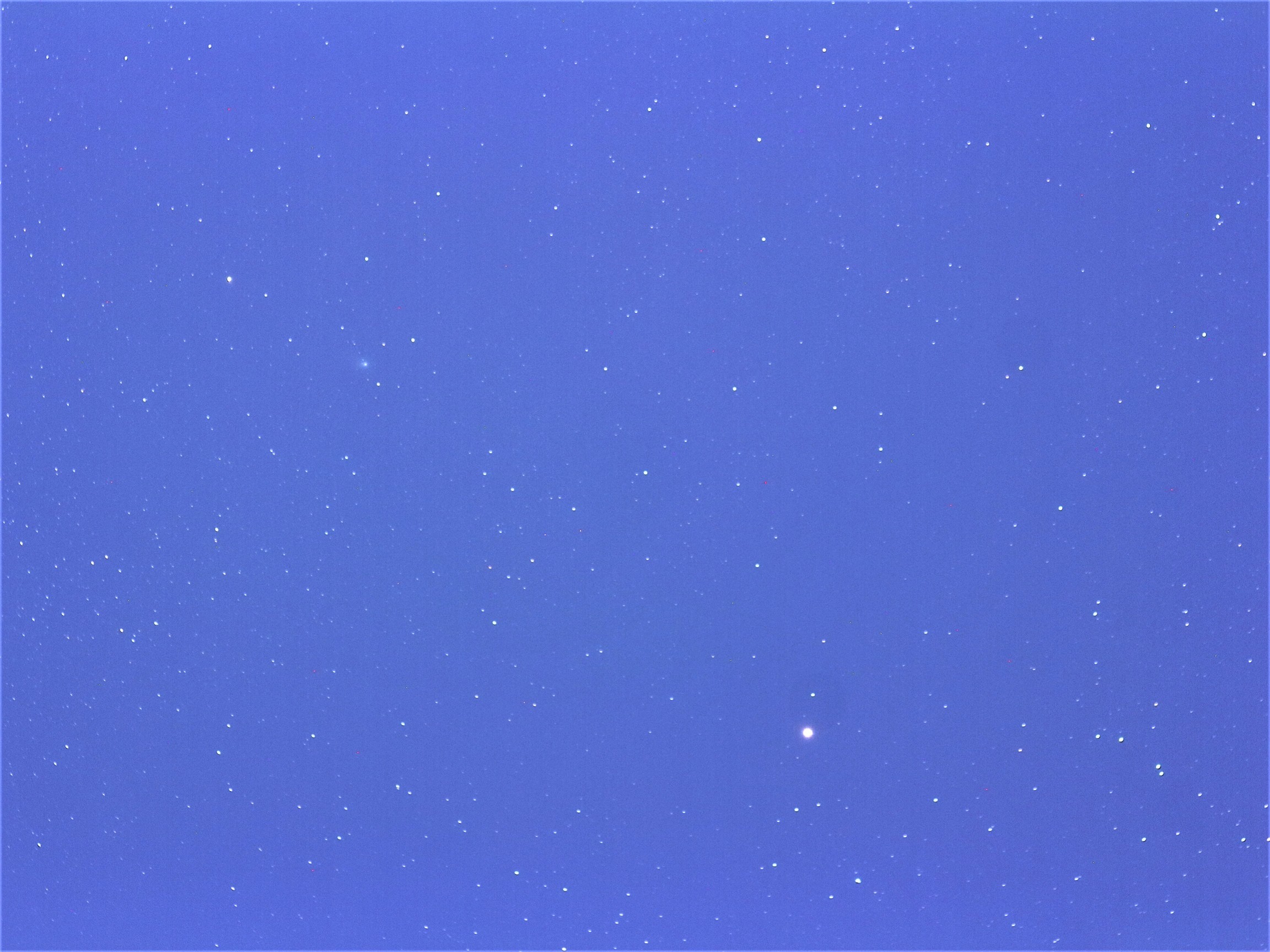 画像2にZTF彗星に注目して焦点距離200mm(320mm相当)、10枚をPOLARISにより自動撮影。ここでもそのまま明るい空の画像。彗星の左上の明るい星はハッサレーです。