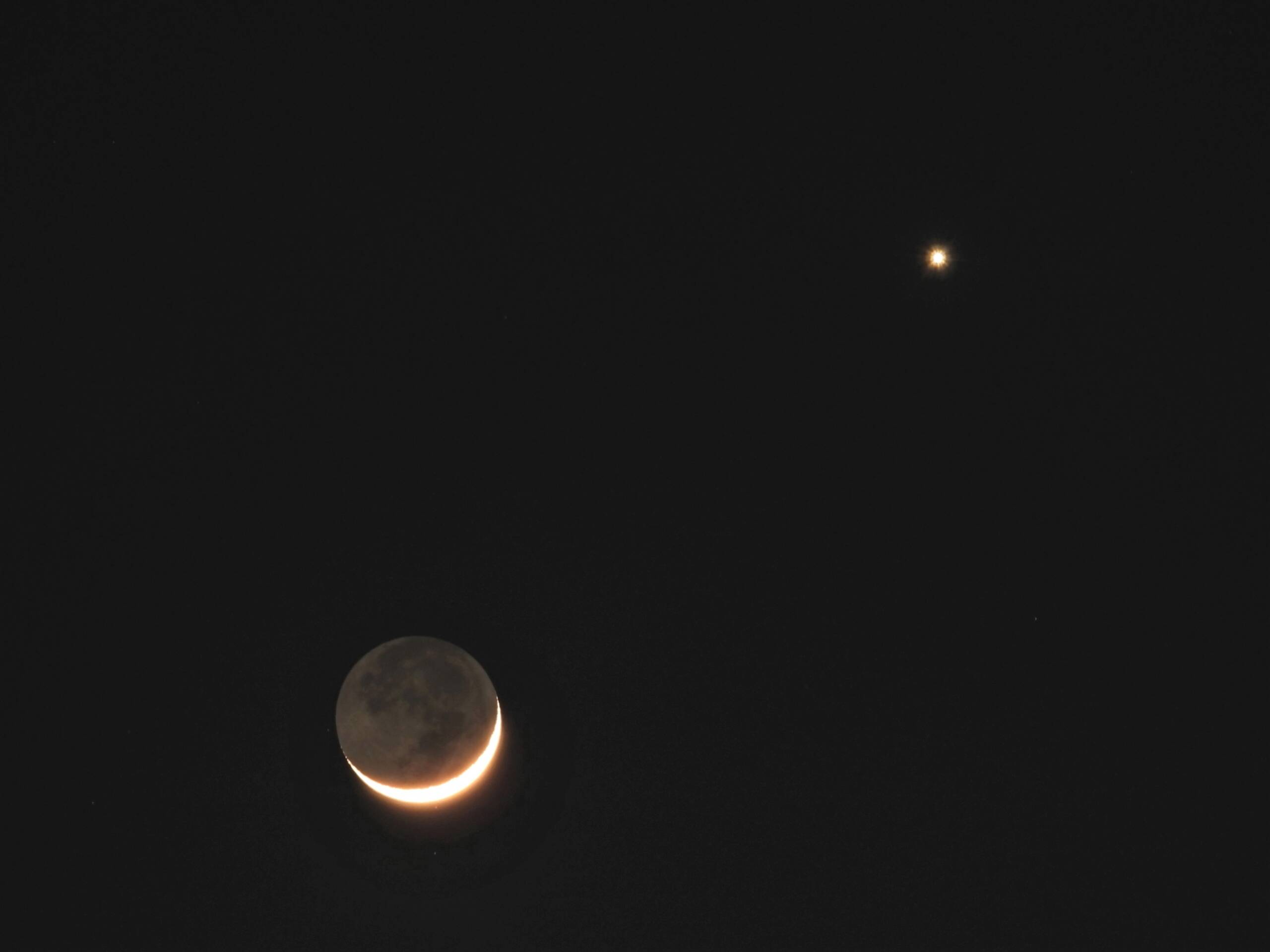 辺りがさらに暗くなると細い月と金星の輝きは相対的に増したように見え、撮影を一時停止し見つめてしまうほど。画像2に焦点距離400mm相当で撮影した月と金星を示します。地球照の月と金星とのツーショット。