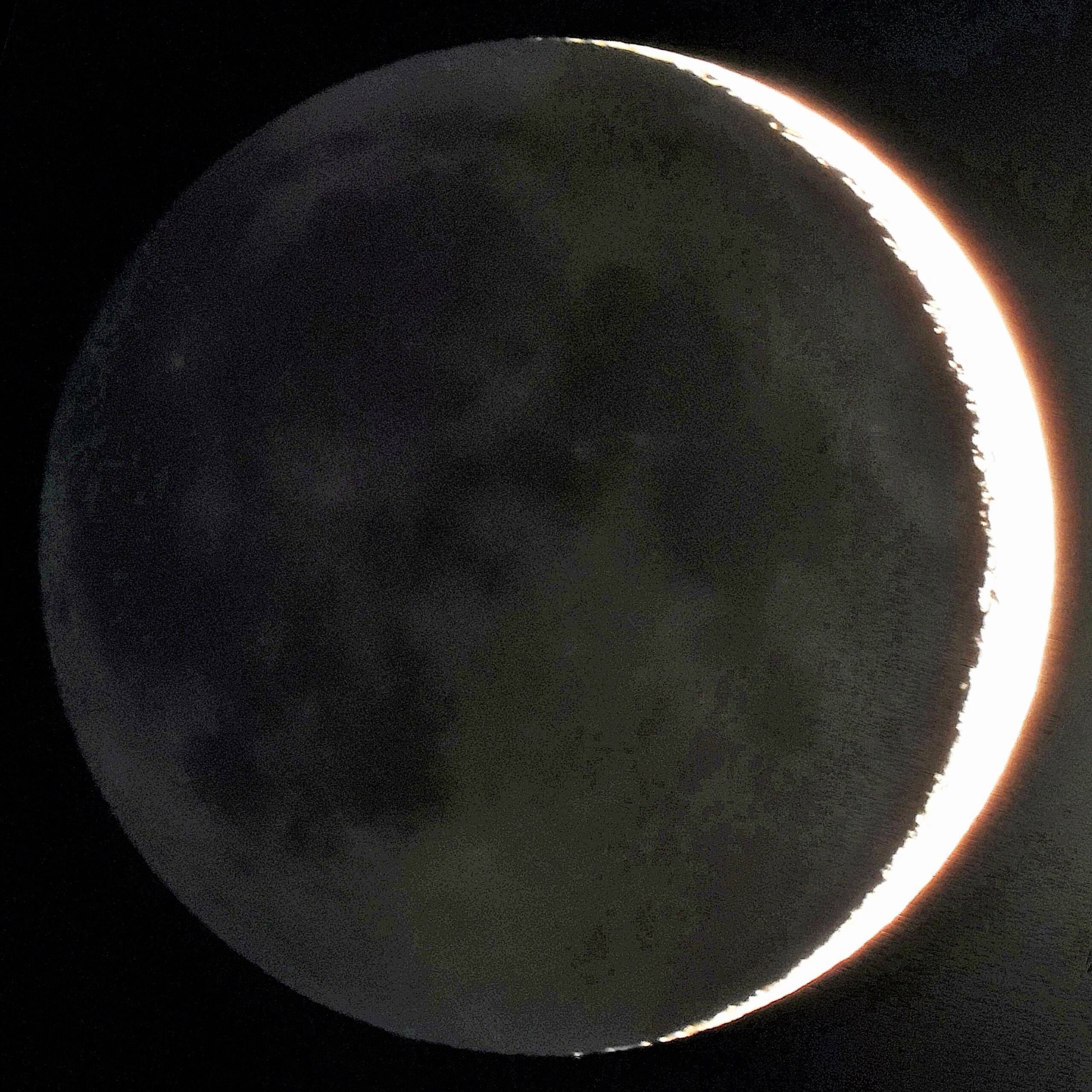 参考に地球照の月を画像5に示します。この撮影時にはかなり高度も低くなるとともに、雲が周りに囲まれてきました。もう少し明るく撮ろうとしましたが間に合わず、もっと早く撮っておけば良かったか。暗めの画像しかありませんがそれを利用し明るさを増して少し月の表面が見えるように。
