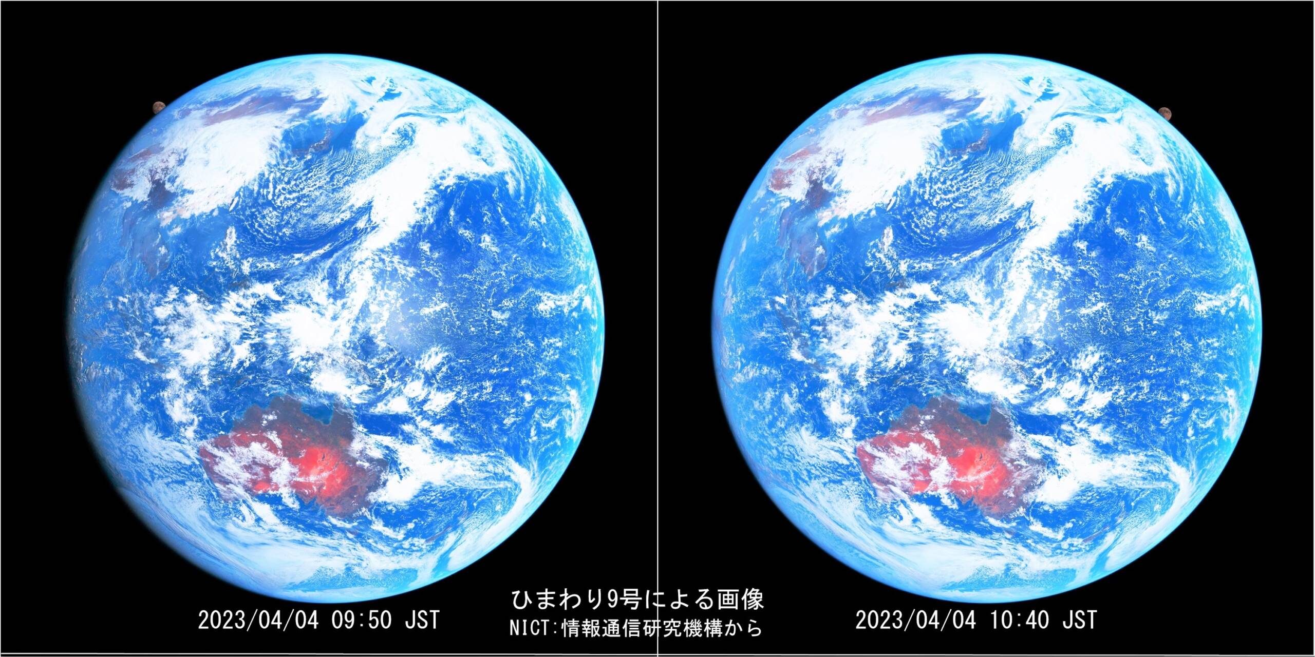 04/04の09:50と10:40の月齢13.3を画像1に示します。データはNICT:情報通信研究機構によります。原画像では月は暗いため見えるように明度を上げて処理しています、画像サイズも大きいので縮小。