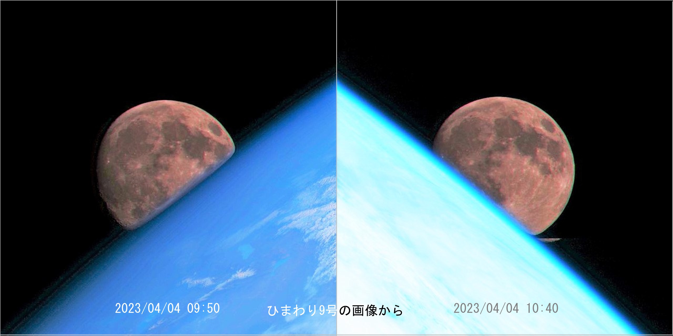 左は月が地球の背後に隠される直前の画像(月の入り)、右は地球の背後から再登場する画像(月の出)。これって、ひまわり9号から見た地球による月の掩蔽。