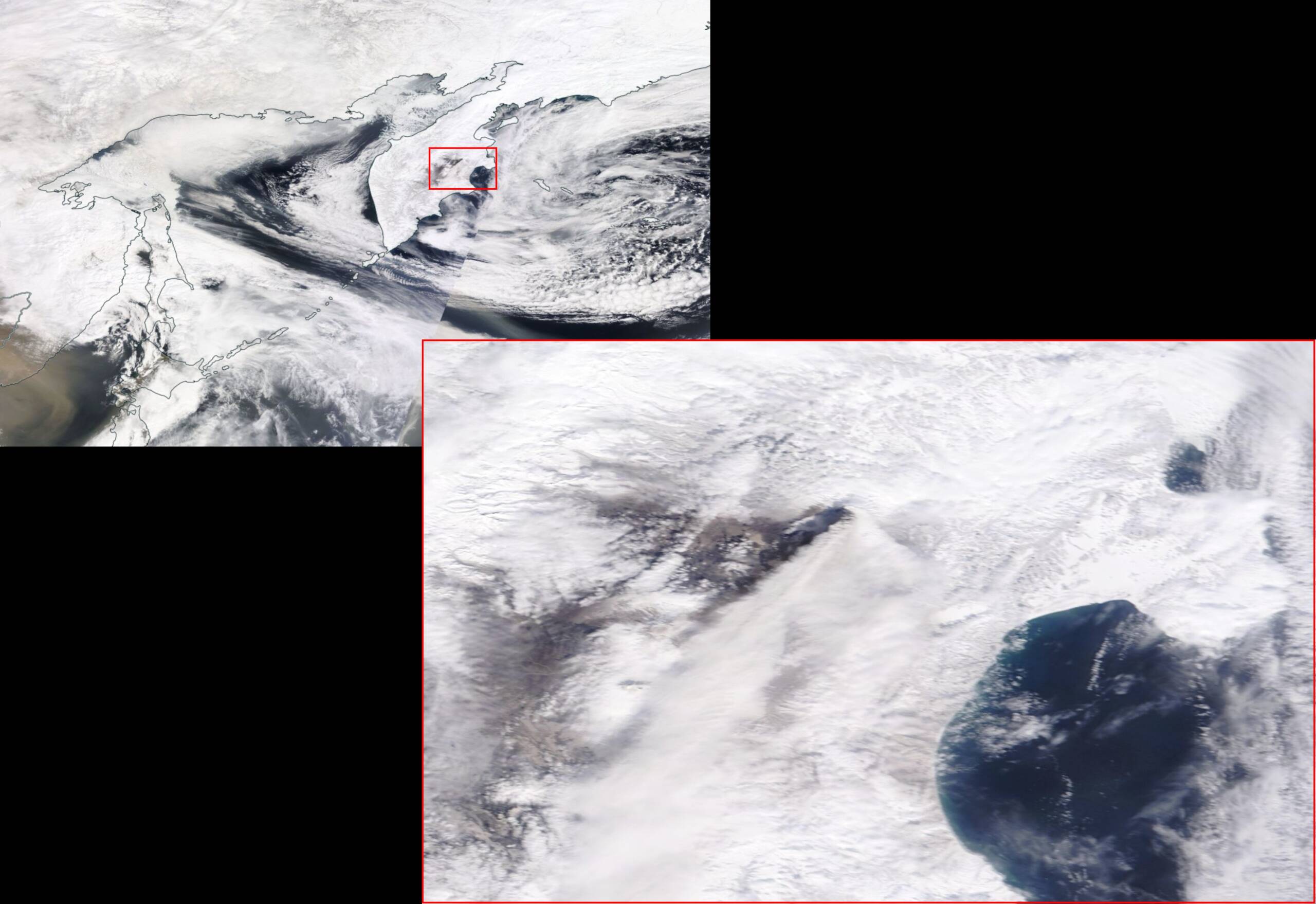 NASA WorldViewの衛星Terraによる2023/04/12時点の画像を確認してみました。画像A-1に示します。左上が北海道からカムチャツカ半島の画像で、右下が赤枠のシベルチ火山付近の拡大画像です。シベルチ火山の噴煙が南西方向に流れている様子が見られています。