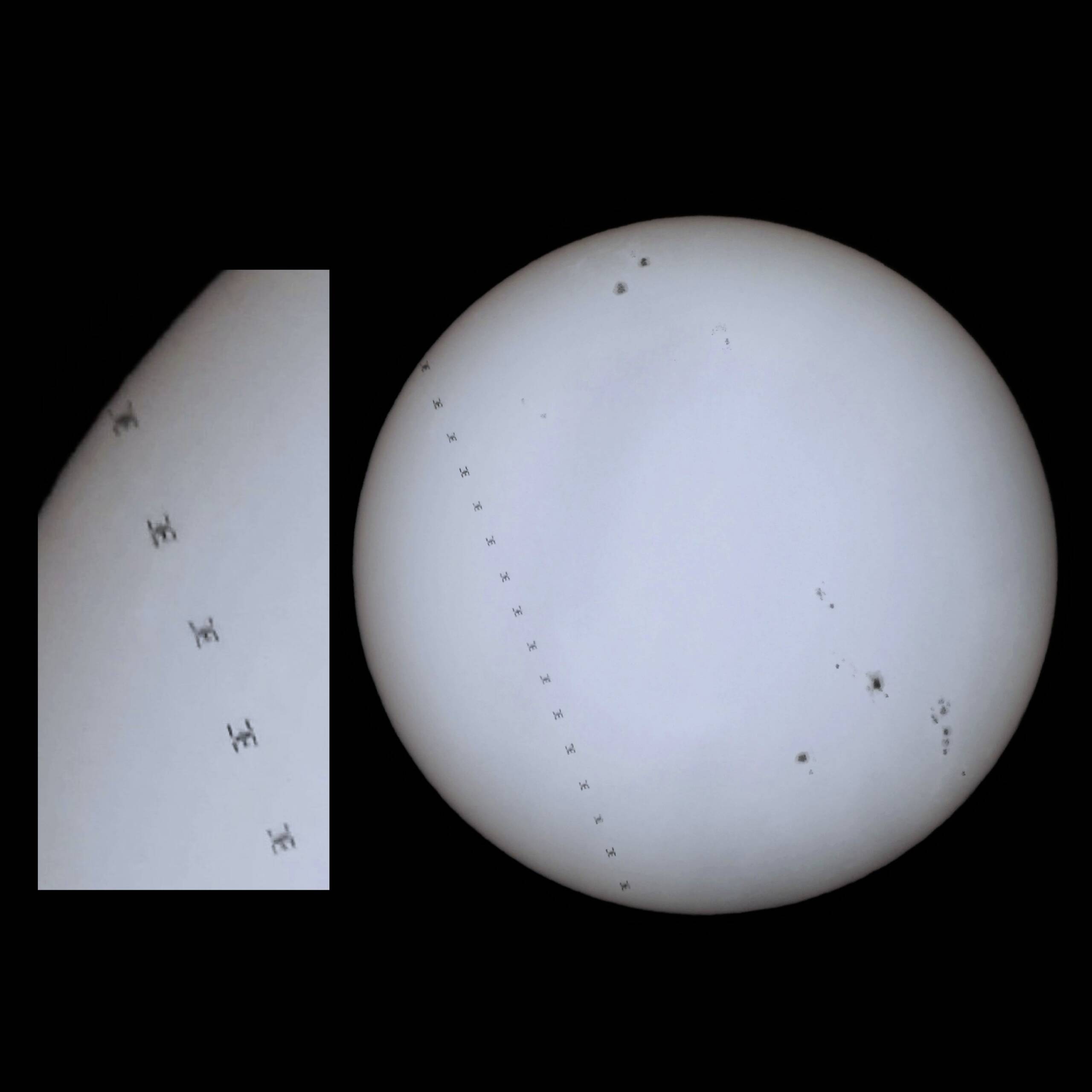 画像1にCSS(天宮)の太陽面を通過する様子を示します。動画からCSSが写っているフレーム17枚を取出しPIPPで太陽をセンタリングしSiriusComp64で比較暗処理したものです。画像はホワイトバランス、薄い雲の影響で暗くなっていますので明るさ等調整しています。拡大するとCSSのシルエット、黒点群の様子がわかります。