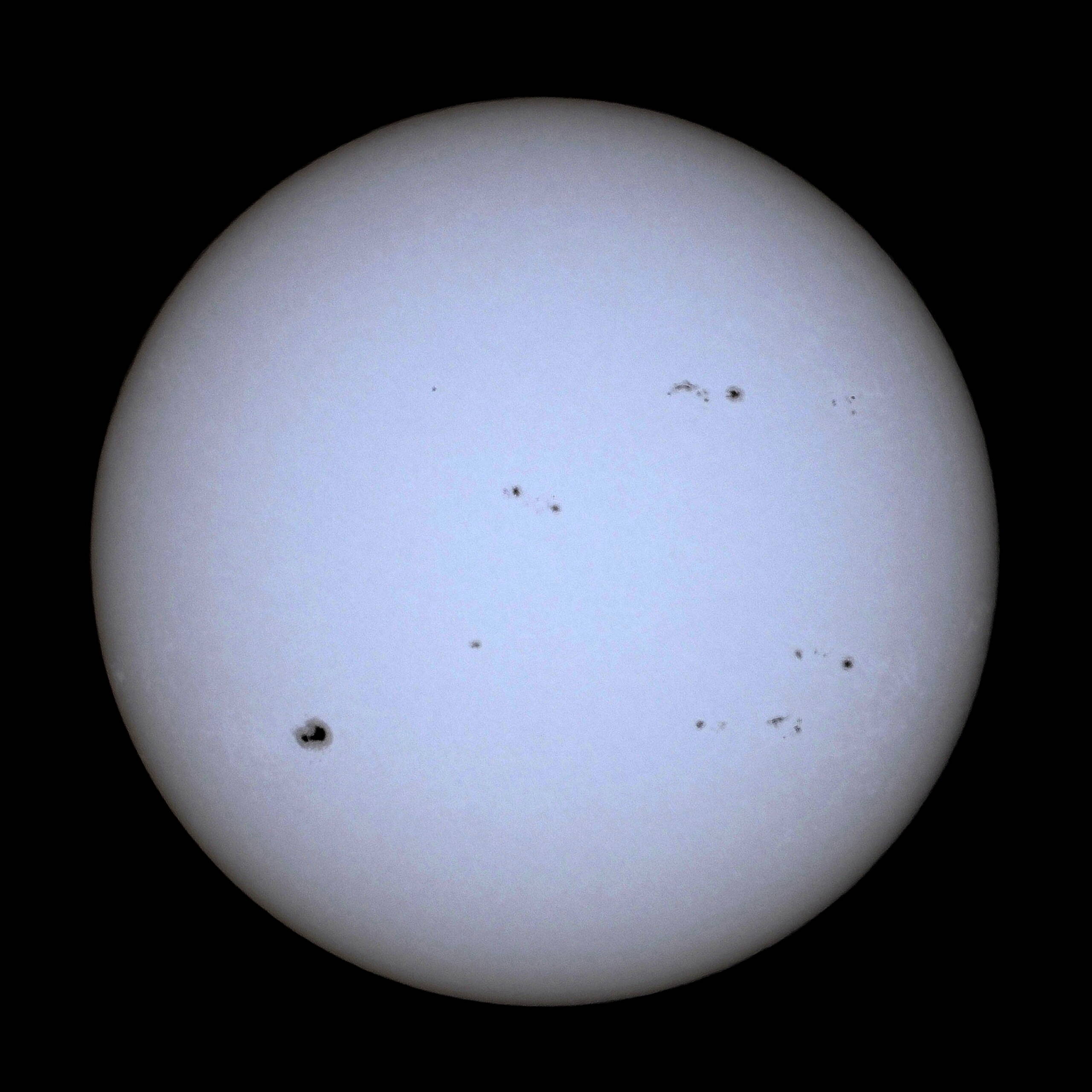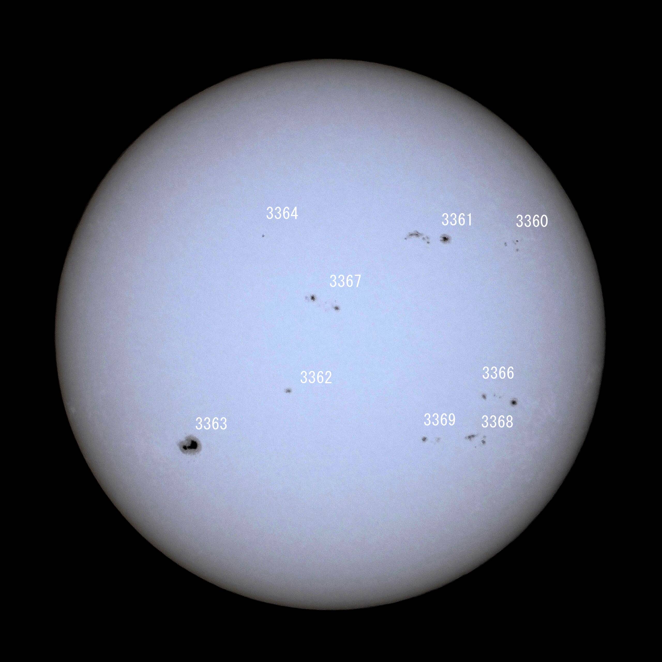 動画も撮ったのですが、ここでは静止画20枚をPIPP前処理、AutoStakkert!3で50%スタック処理およびRegiStax6でWavelet変換を通して調整し画像1に示します。太陽可視像(太陽フィルターを通して。直視は危険)からはわからないのですが、SOHO等のサイトデータを見ると活発であり、黒点数もそれに応じて多く感じました。参考に黒点番号を付けて画像2に示します。(番号付けしながら黒点を見るのも楽しい)