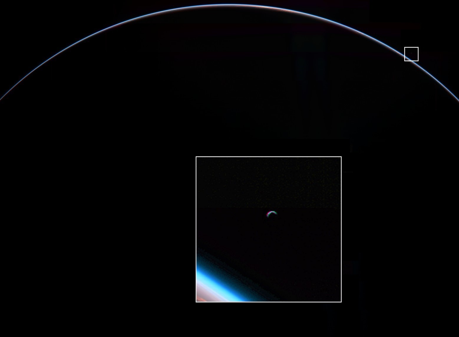 最新のひまわり画像に写った金星を画像1に示します。地球と金星が写っている領域を切り取り、中央に明るく調整した金星を表示しました。この画像は2023/08/13 23:50で内合直後になります。四角枠に写っている領域を拡大し明度を上げると光っている円弧の様子がわかります。