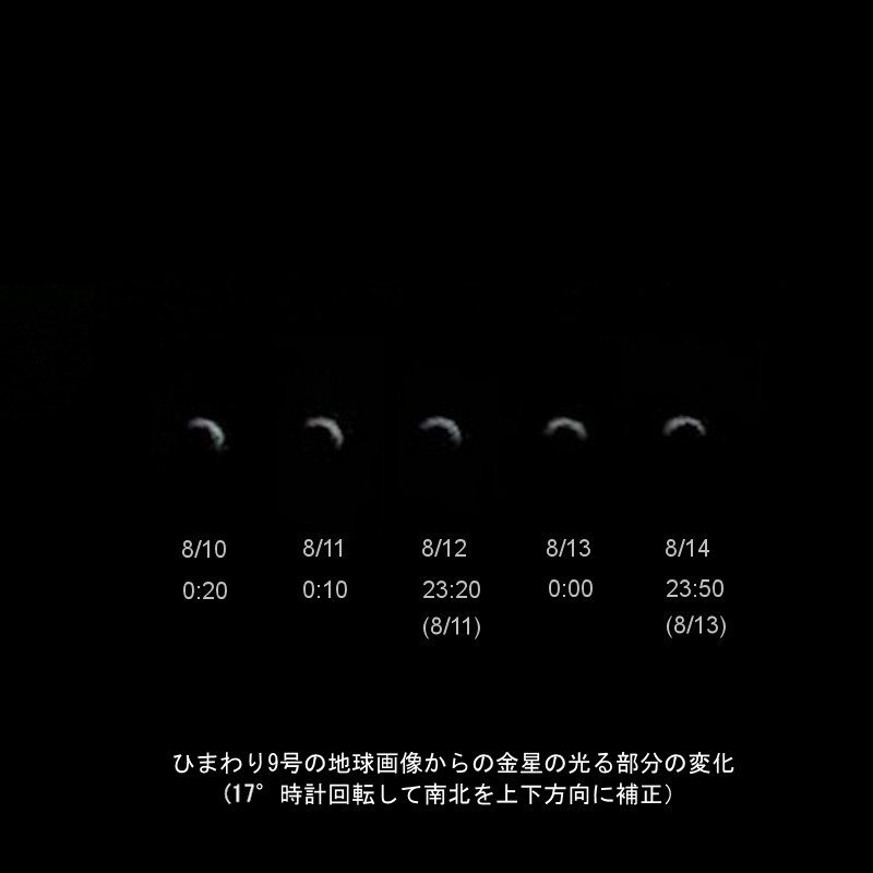 ひまわり9号の金星日記から今回の内合前後の画像を切り出し、並べると画像2のとおりです。原画像は金星を撮っているわけではないので画像はとても粗いものになります。しかし、金星の光っているおおよその形はわかります。この金星の画像は縦軸が南北になるようにしています。8月10日から一日間隔(途中、0時近くで前日の画像になってしまう場合は括弧書きにしています)の金星の変化を示しています。8月10日では右側(東)が光っていますが時間が進むに連れて反時計回りに回転し、8月14日には北の部分が光って見えています。地球から見て、太陽の方向より金星が少し下にあるのでそのように見えるのでしょう。