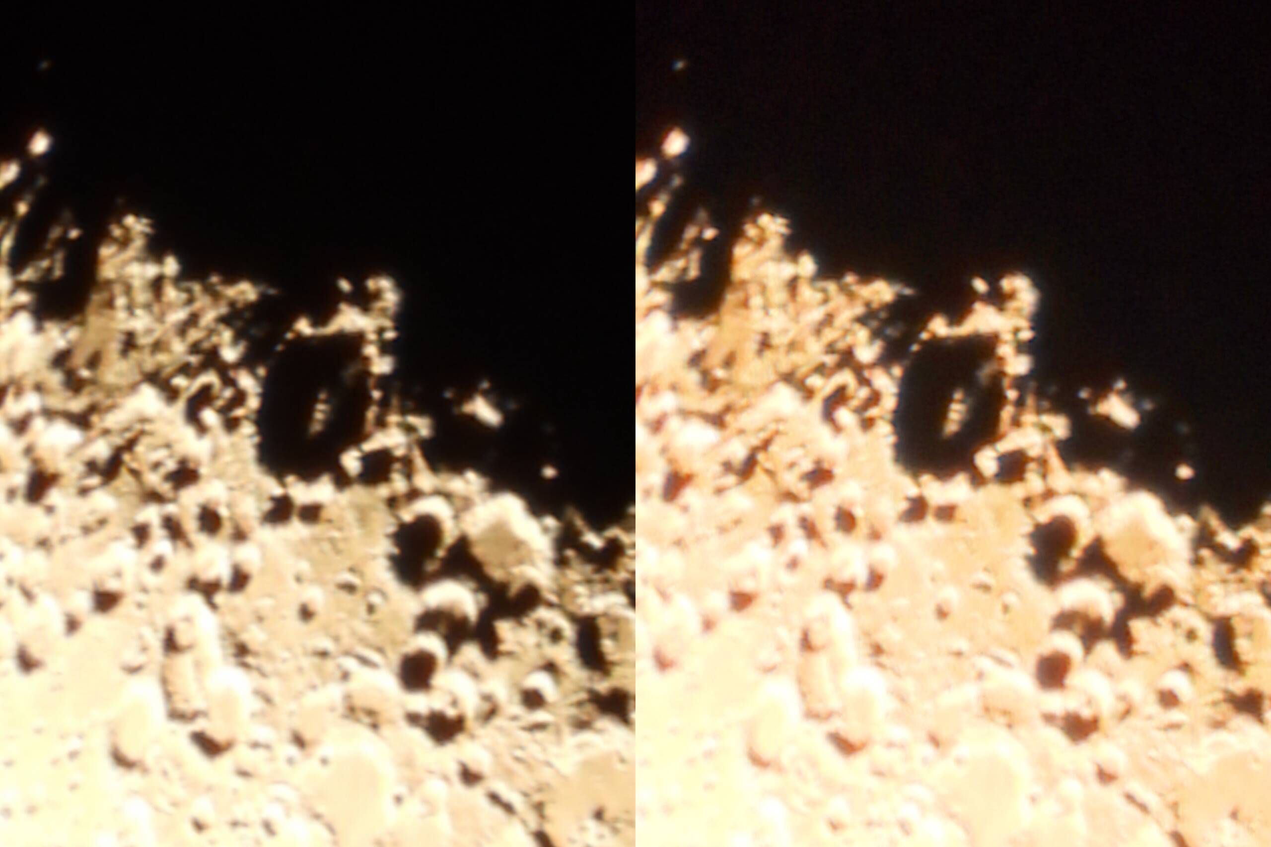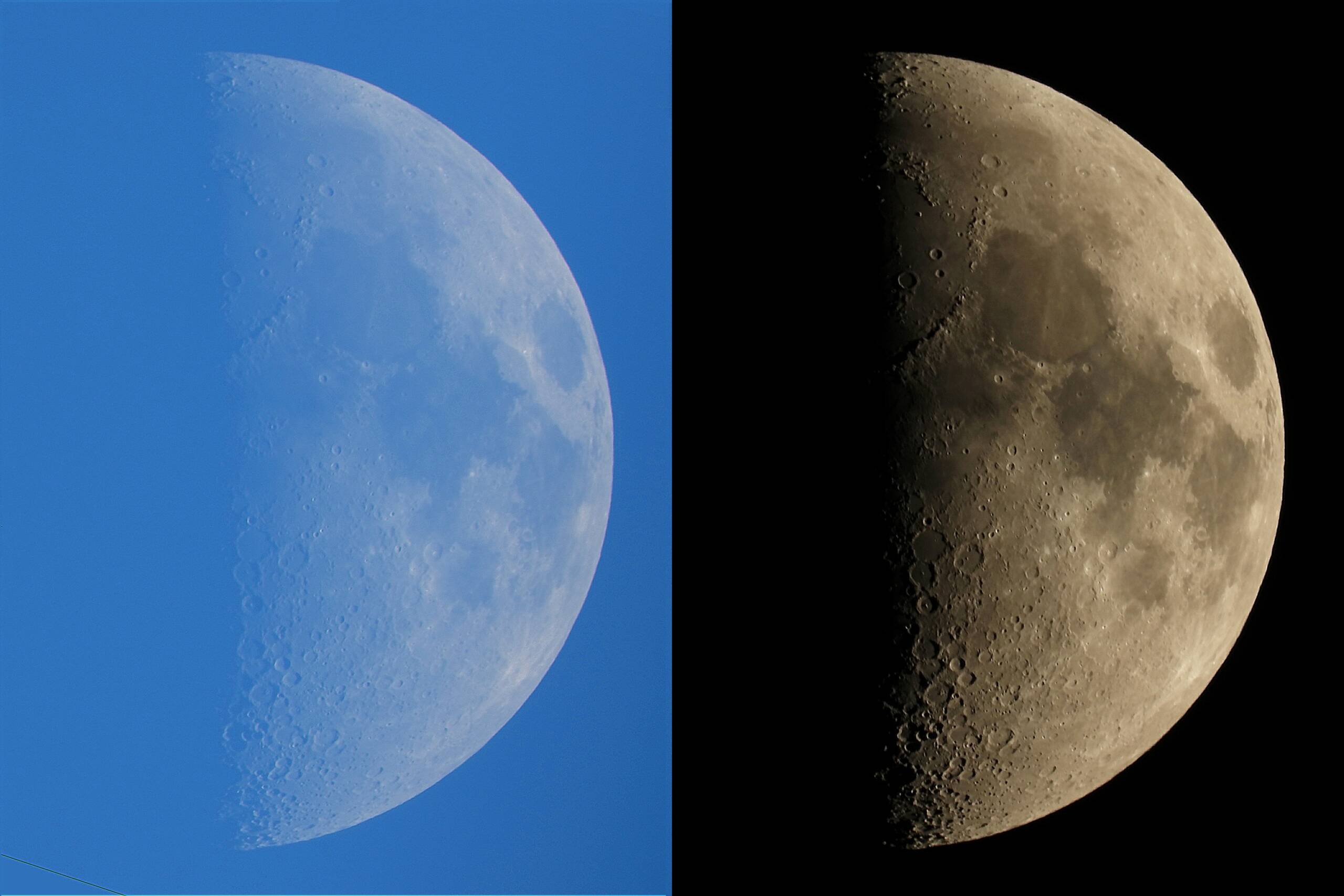 画像1 月齢7.9と月齢8.1の昼夜の月 2023/08/24 COOLPIX P1000 (左:16:52 ISO-100 f/8 2,000mm相当 1/200s 10枚スタック、右:19:59 ISO-100 f/8 2,000mm相当 1/80s 6枚スタック )