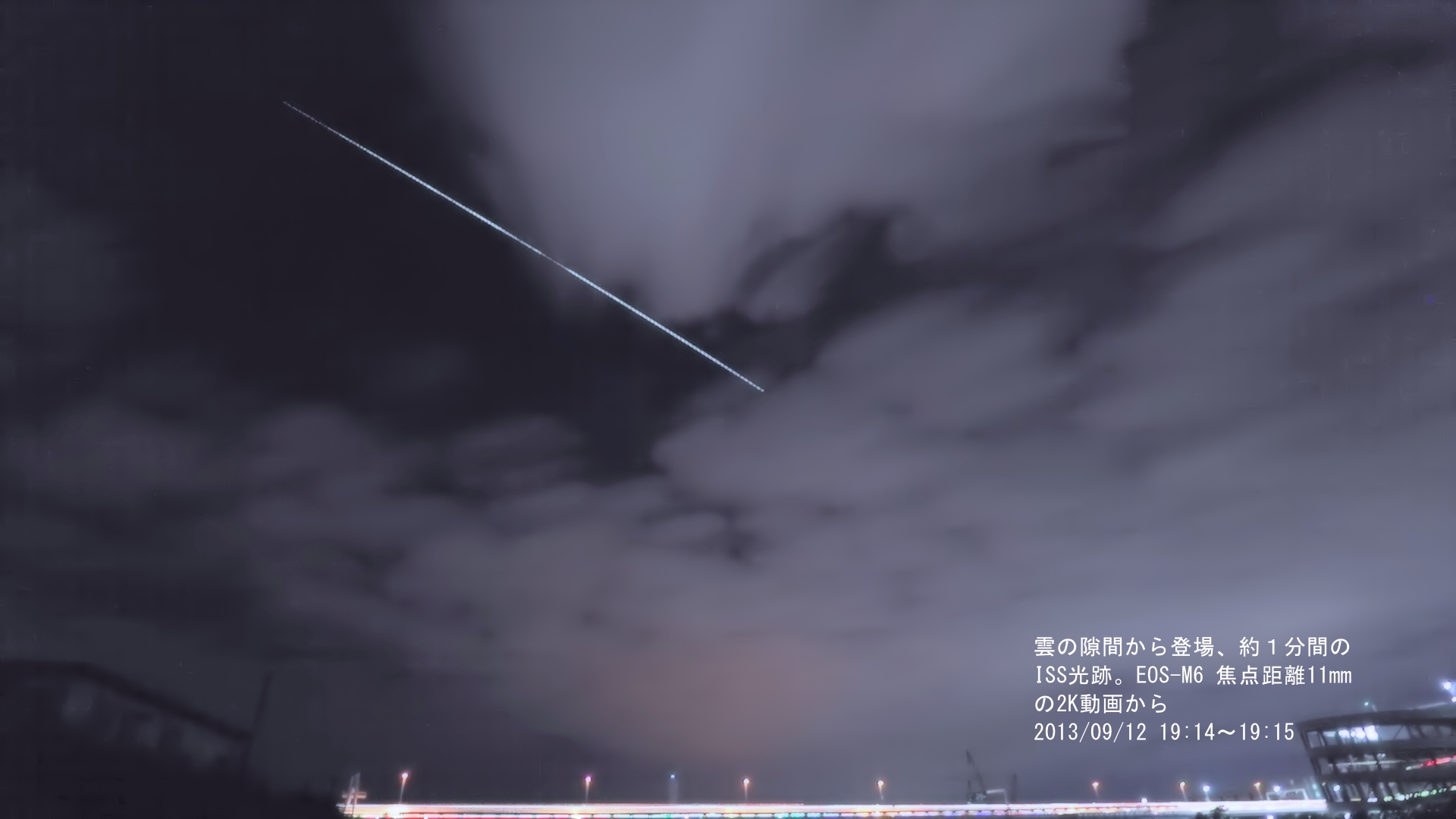 画像1 ISS光跡 2023/09/12 19:14~19:15 動画1(原映像)から比較明処理等