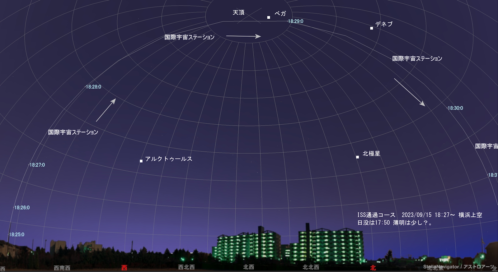 画像2 ISS天頂通過の予想 2023/09/15 ステラナビゲータ12による (元期 2023年09月12日12時12分25.856626秒(UTC))