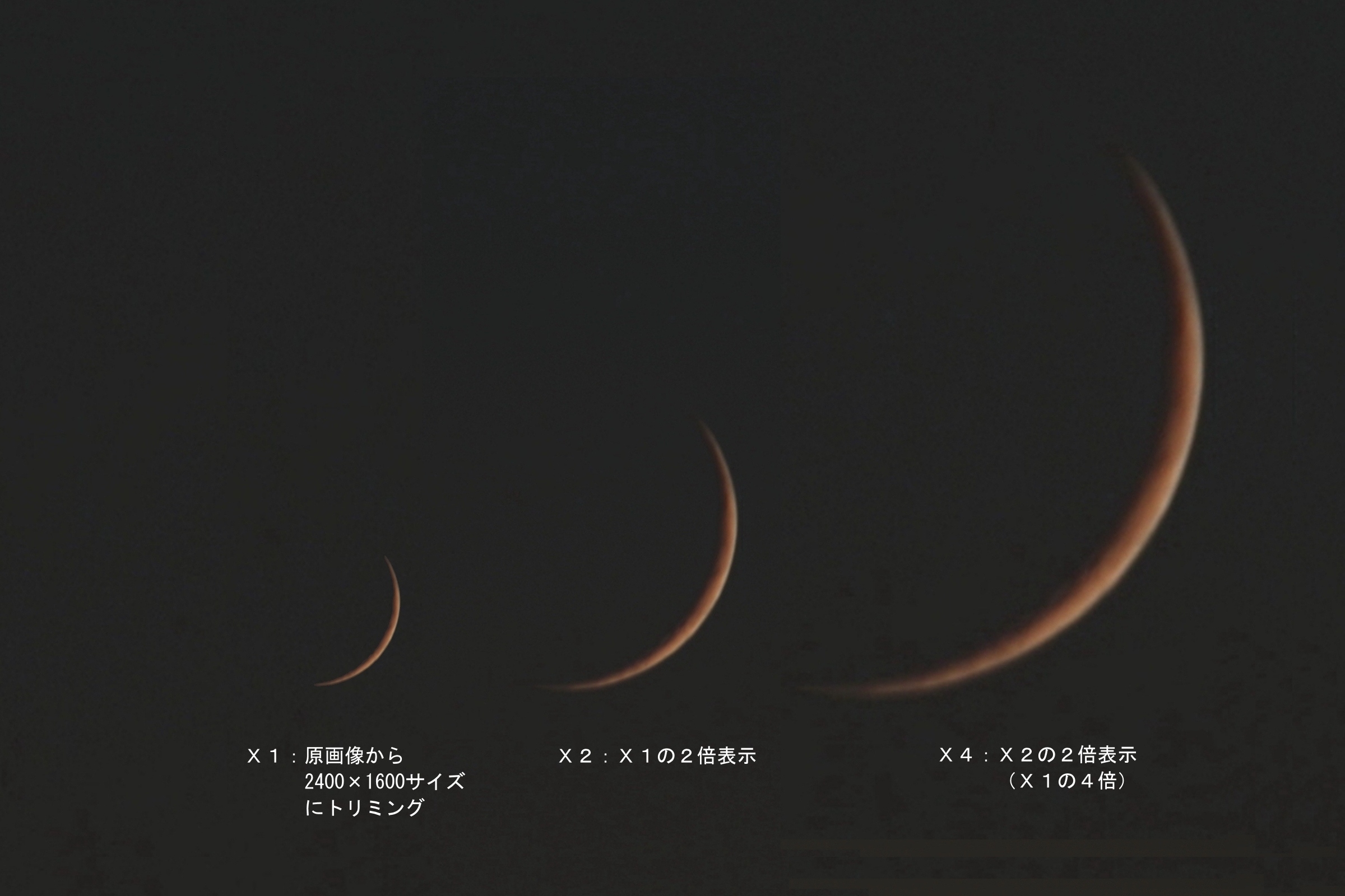 参考に上記画像がどの程度の拡大で表示されているのか同焦点距離で彗星撮影10分前に撮影した月の原画像から同様サイズ2,400×1,600に切り取った画像、それと2倍、4倍の画像を比較のため画像4に示します。写野の大きさ、画像の大きさの感覚がつかめると思いました。