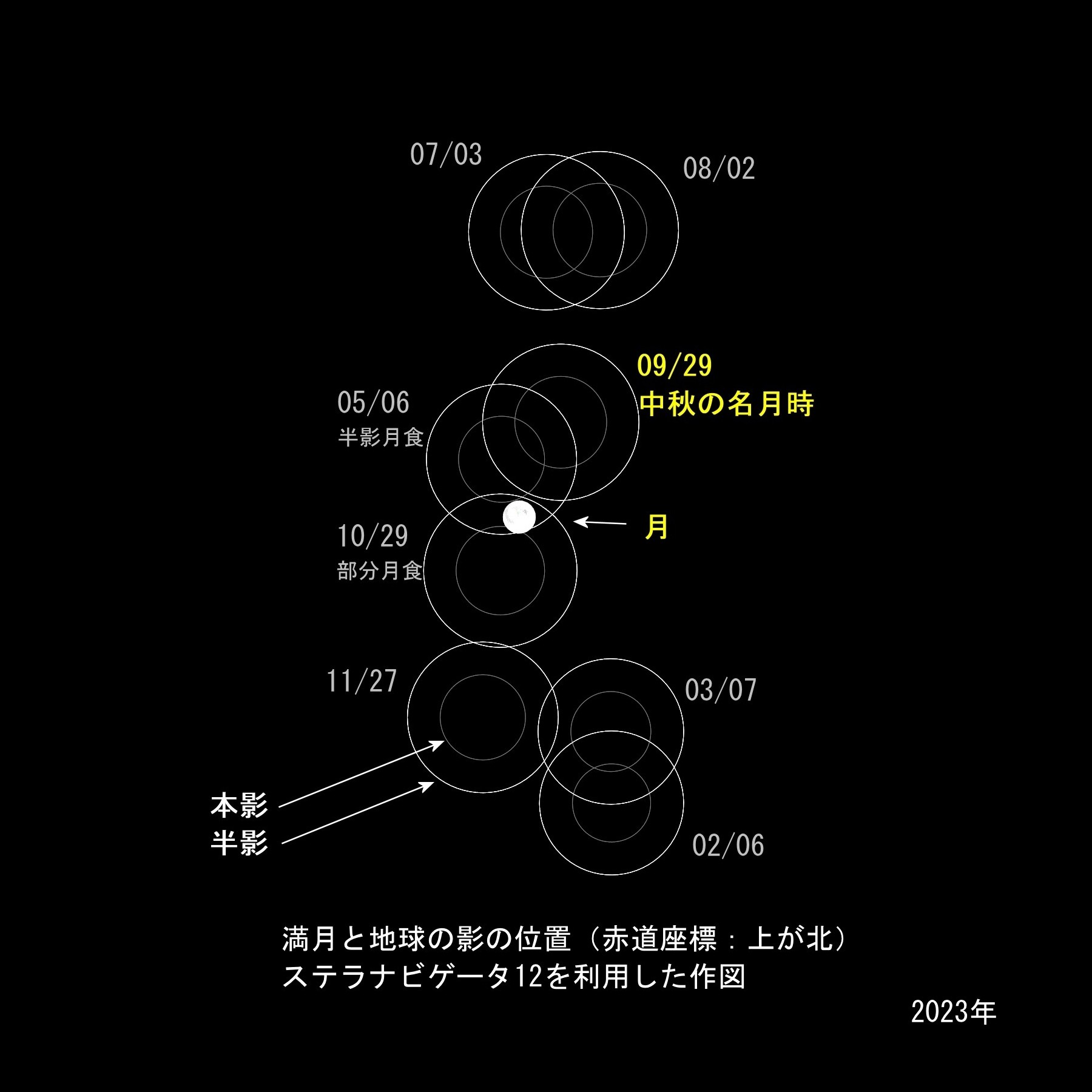 画像3 2023年の満月と地球の影の位置関係 ステラナビゲータによる作図