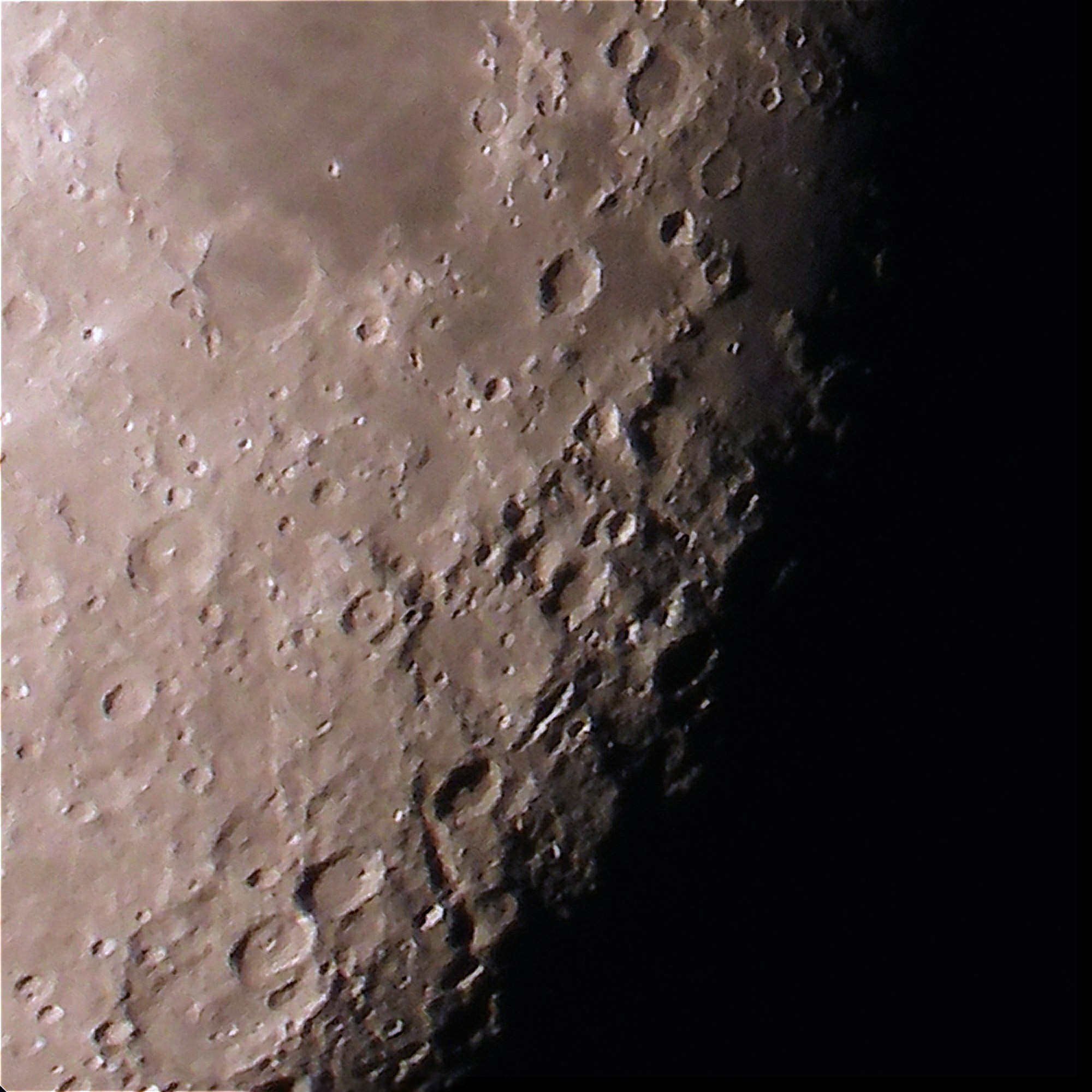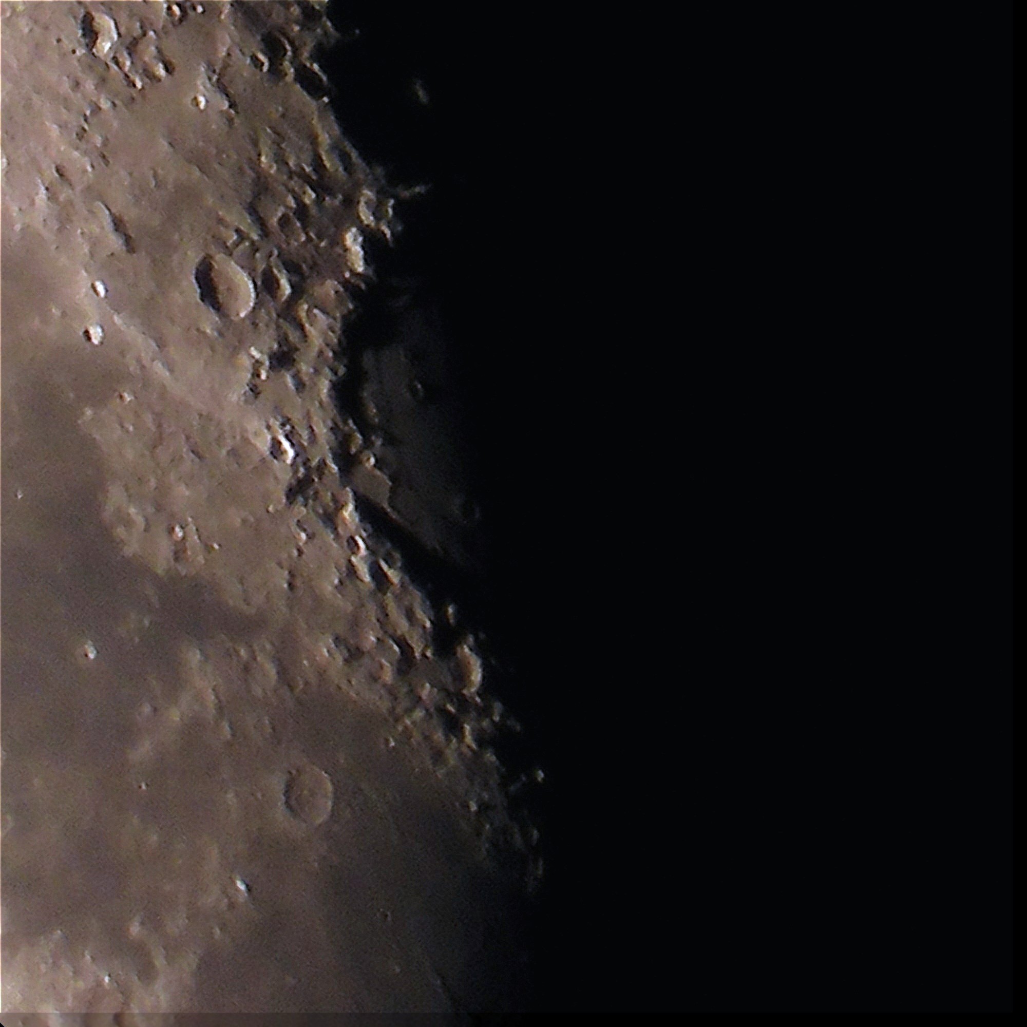 画像1に月齢17.4の全体、画像2および画像3にそれぞれオニール橋と月面Kの領域を示します。当日は大気の流れからかかなりユラユラしていてスタックするとぼやけ気味になりましたので全て単独一枚画像を選び載せました。オニール橋は影と右側に広がる光が射してそれらしく見えていました。月面Kは拡大画像よりも画像1の方がそれらしく見えます、光が少し当たり過ぎて、タイミングが少し早すぎたかも。