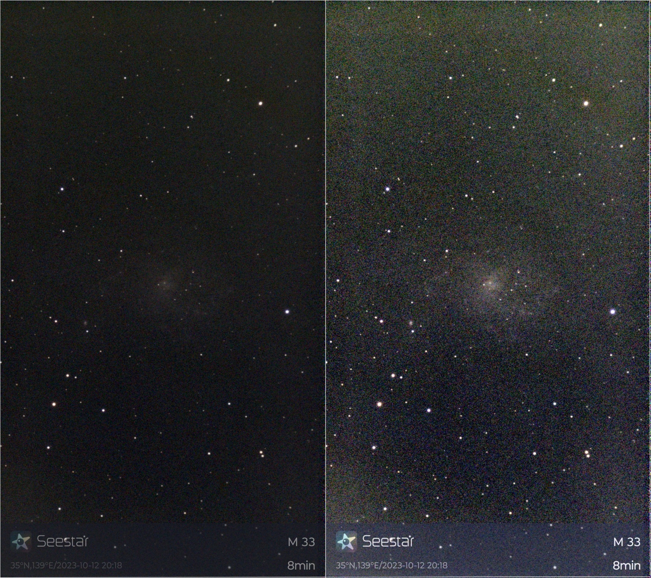 画像2に撮影途中になってしまいましたがM33を示します。左が原画像、右が調整画像です。光を感じている程度の写りでしょうか、撮影枚数を稼ぐだけでなく、暗い場所でないと無理とも思いますが後日、撮り直してみたい(ネットで調べた限りでははSeestarで撮ったこれらの銀河は良く撮れています)。