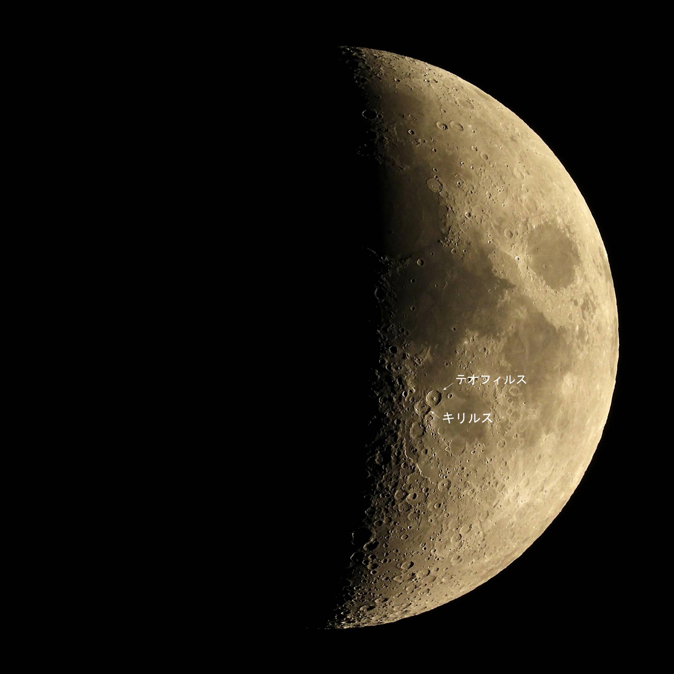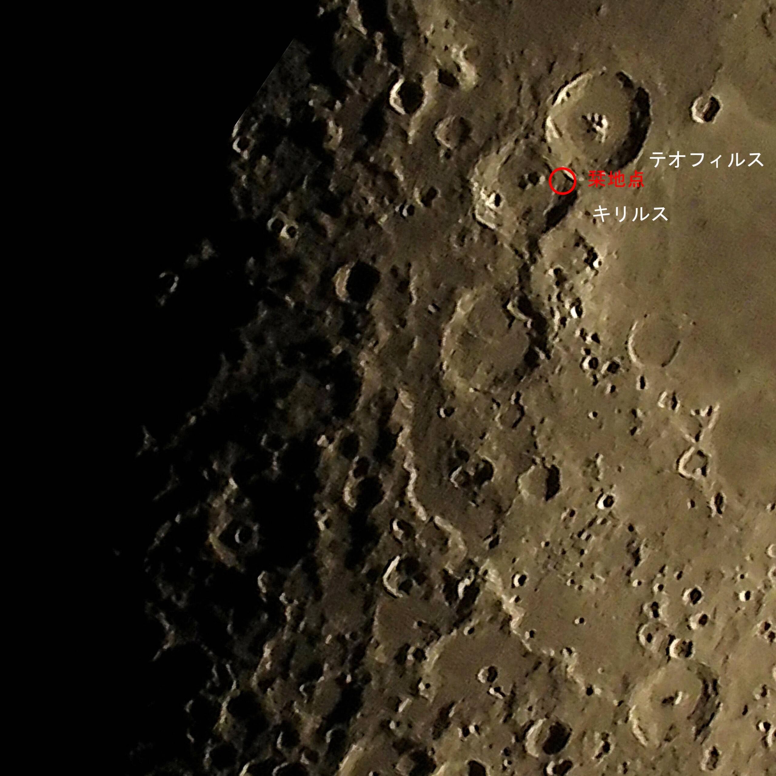 画像1は月齢5.9の全体画像と画像2に着陸点”キリルス”内の”栞”のおおよその位置を示します。とてもわかりやすく、あそこか、と見えなくても見えているような想像できる地点です。