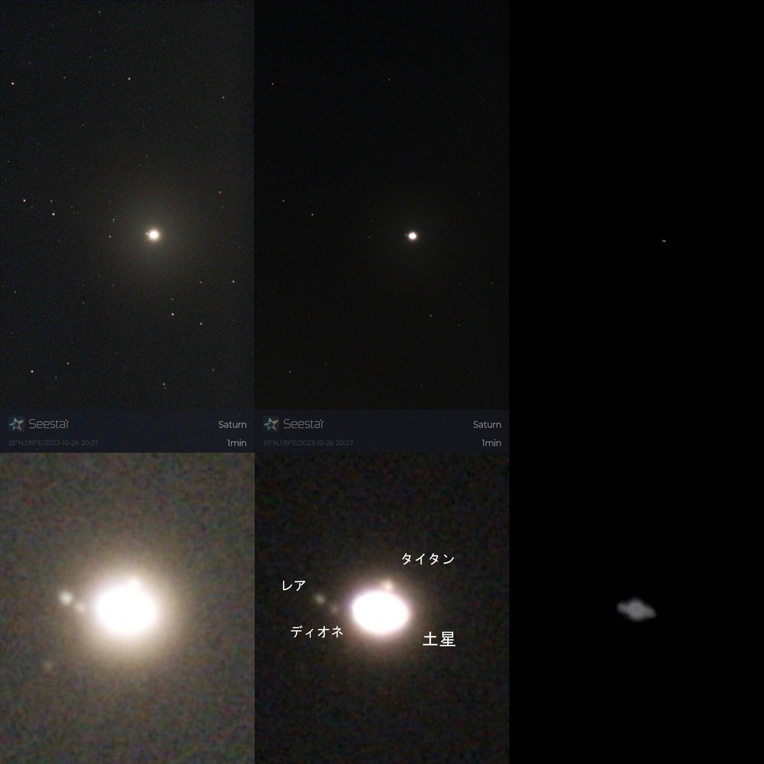 導入は星図から土星を指定して移動、センタリング。問題は撮影条件、任意に設定ができません。標準的な10秒間露光スタックモードのままで撮りましたが明る過ぎて土星がボーっと広がってしまいました。明るさをSeestar画面上にあるスライダーで-100%暗くして再度撮影、しかしそれでも明るく撮れてしまいました。それぞれ画像1の左と中央の画像に相当します。1分間のスタックでしたが10秒後の一枚であっても明るく撮れ過ぎて写り具合はそんなに大きな差は見られませんでした。