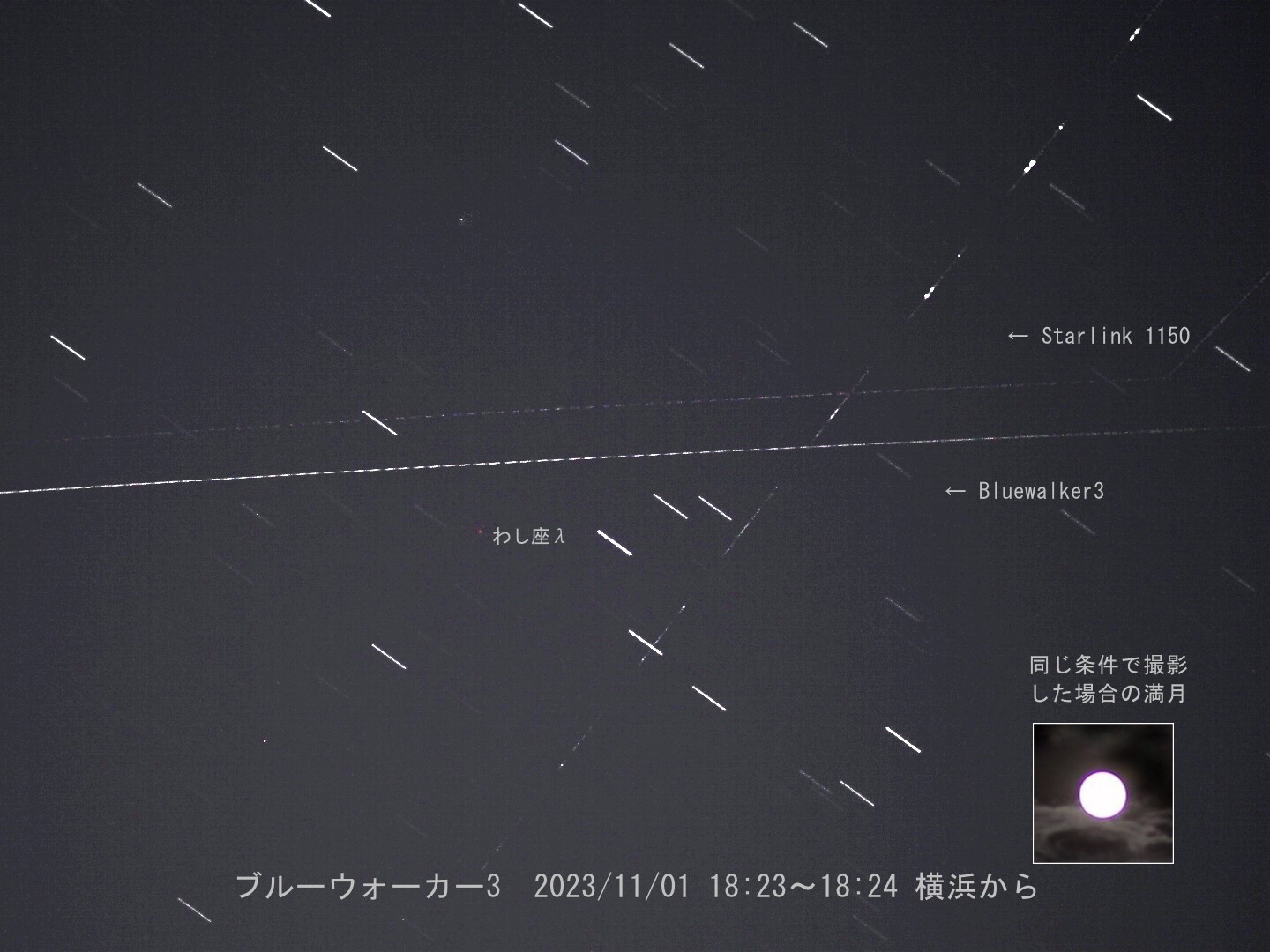 ブルーウォーカー3(以下BW3:BlueWalker3)の夕方における日本上空通過は今週のみしかチャンスが無く、次のチャンスは12月中旬になってしまいます(早朝通過はその限りではありません)。11月01日の通過が下記の条件でしたので光跡を捉えたいと撮影に臨みました。BW3の撮影は前回、一年前No.1105のとおりで明確な光跡は得られませんでした。