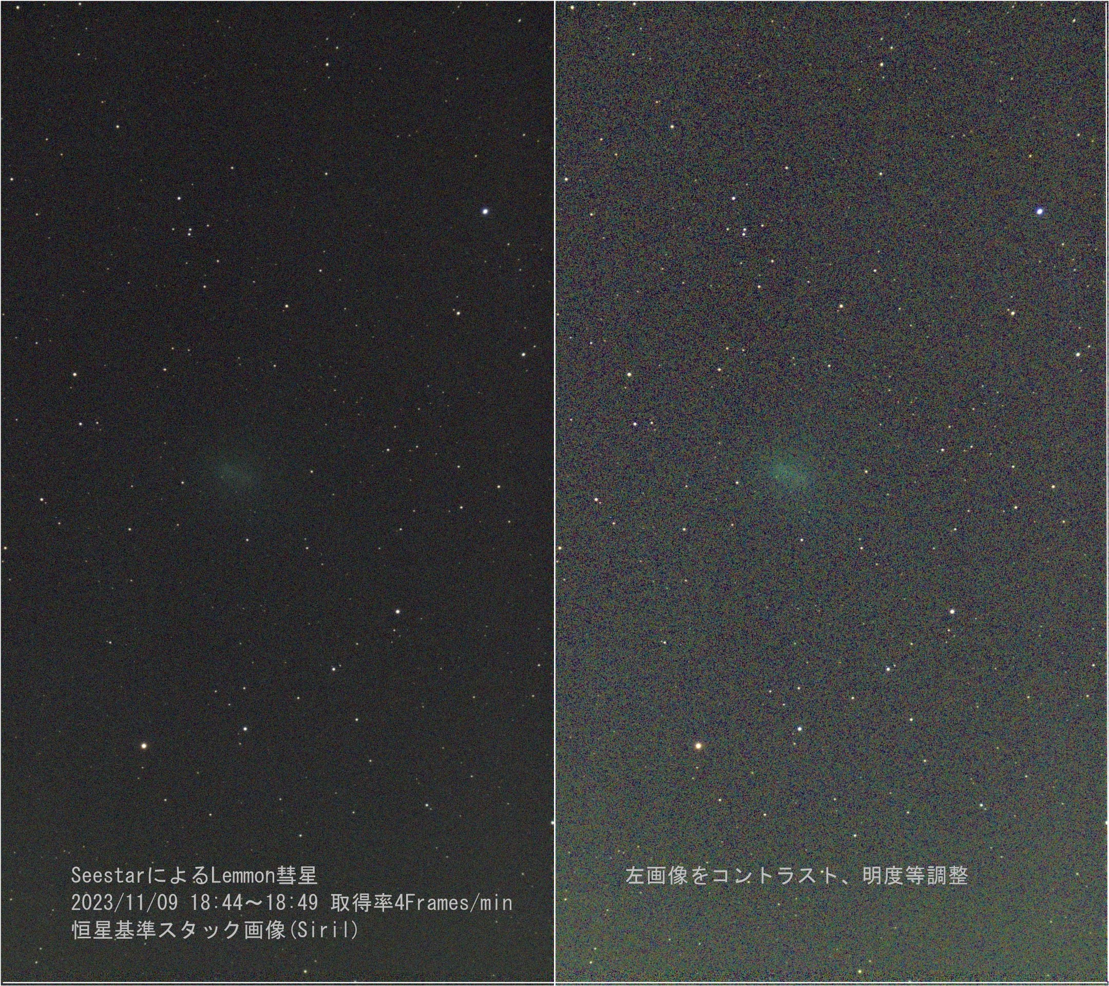 画像1の左側はSiril処理直後に得られたままの画像です。右側はその画像を彗星が目立つように調整しています。