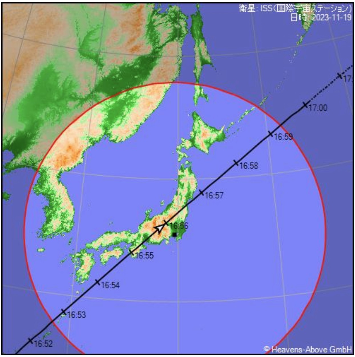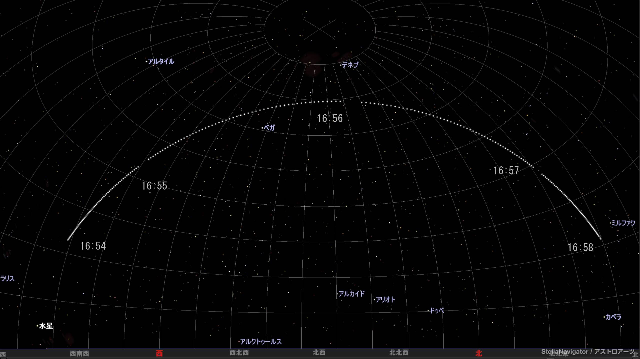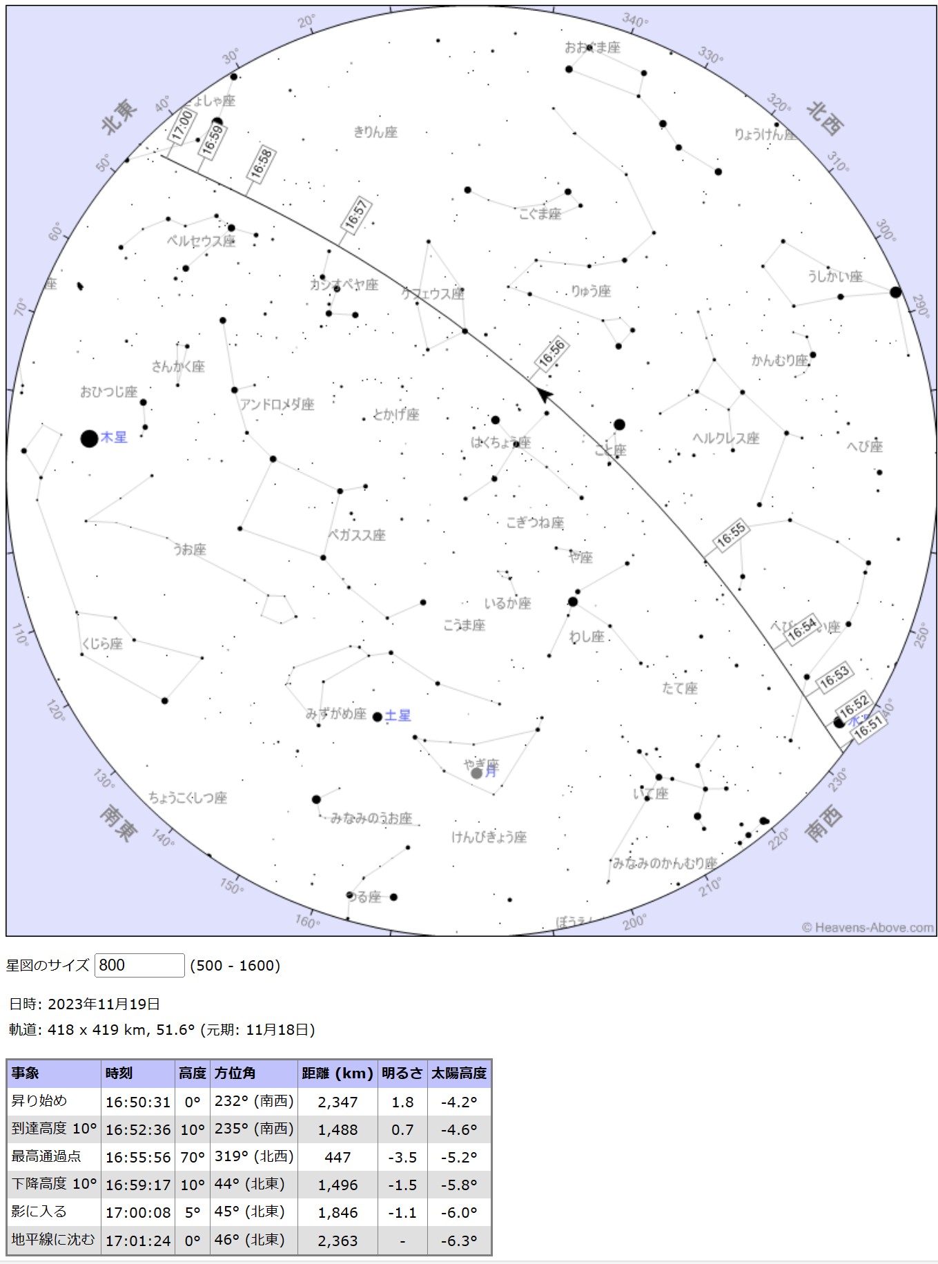 参考欄にHeavens-Aboveによる星図、地上軌跡のデータを載せましたが、横浜からは最初、逆光のため南西から近づいているのですが電池パドルの反射光は見えません。北東に進み順光になると徐々に反射光は薄く見え出しました。