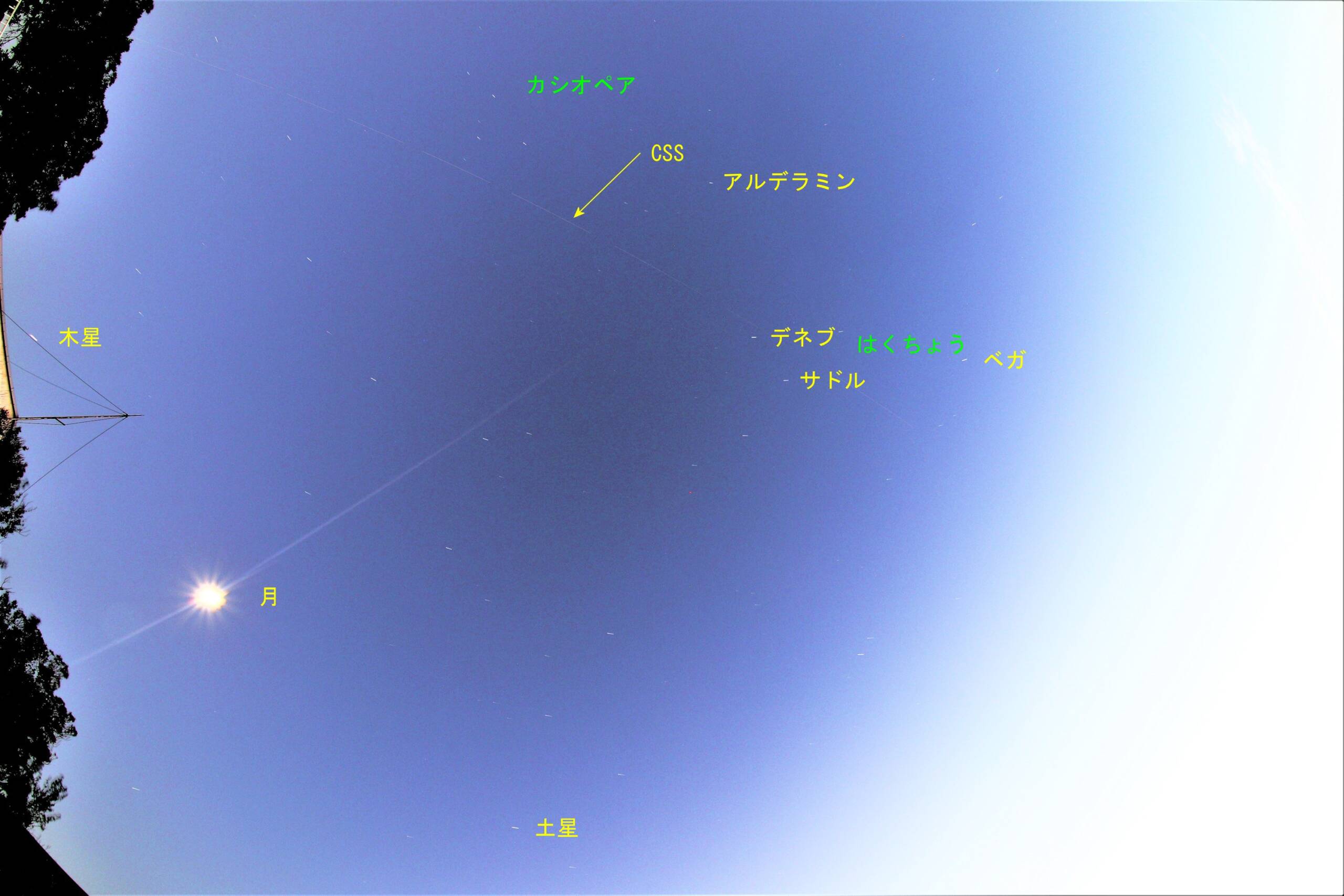 この時間帯の空の明るさから光跡は無理かもと思いましたが、セットしておけば自動リモコンシャッターで画像集が得られますのであるがままに。比較明処理し画像2に示します。そのままでは見えませんのでコントラスト、明度を調整し、はくちょう座とカシオペア座の間に薄く光跡線が浮かび上がるようにしました。目では月と木星以外は明るすぎて見えませんでした。