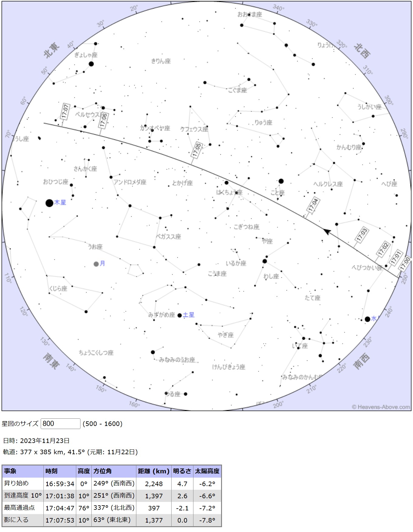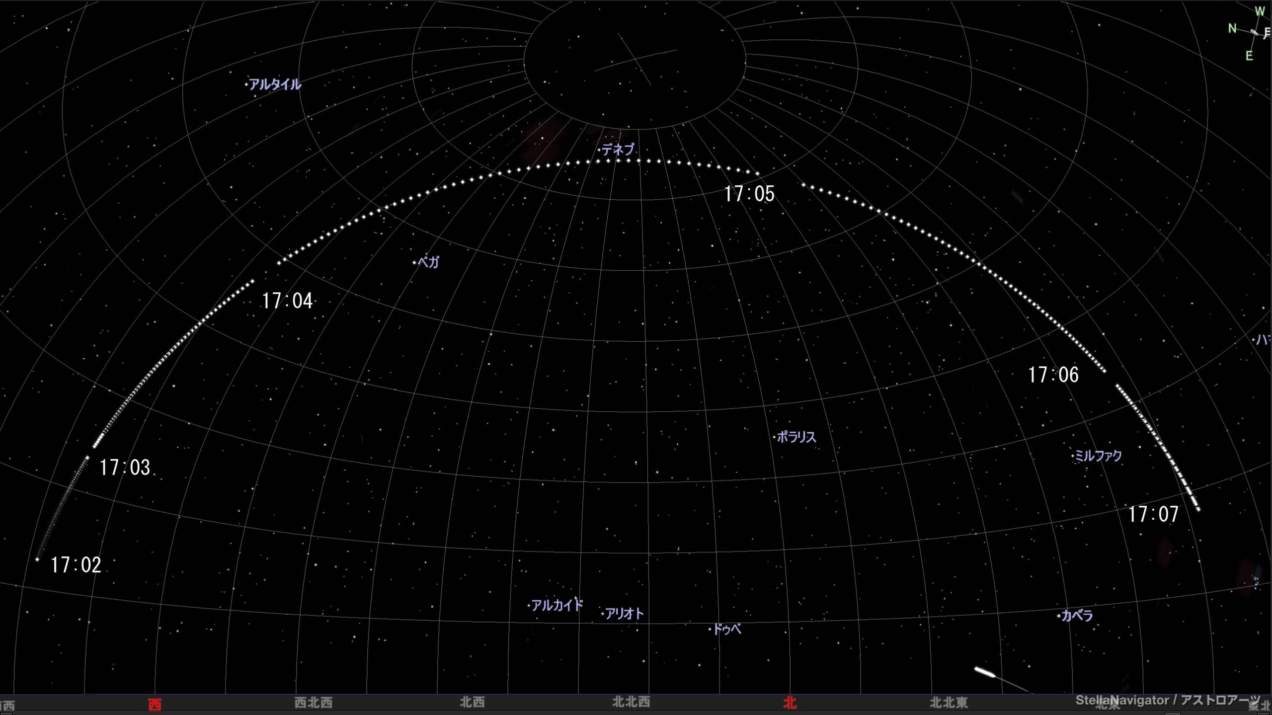 当日のHEavens-AboveおよびStellaNavigator12の通過予想データを以下に添付しておきます。