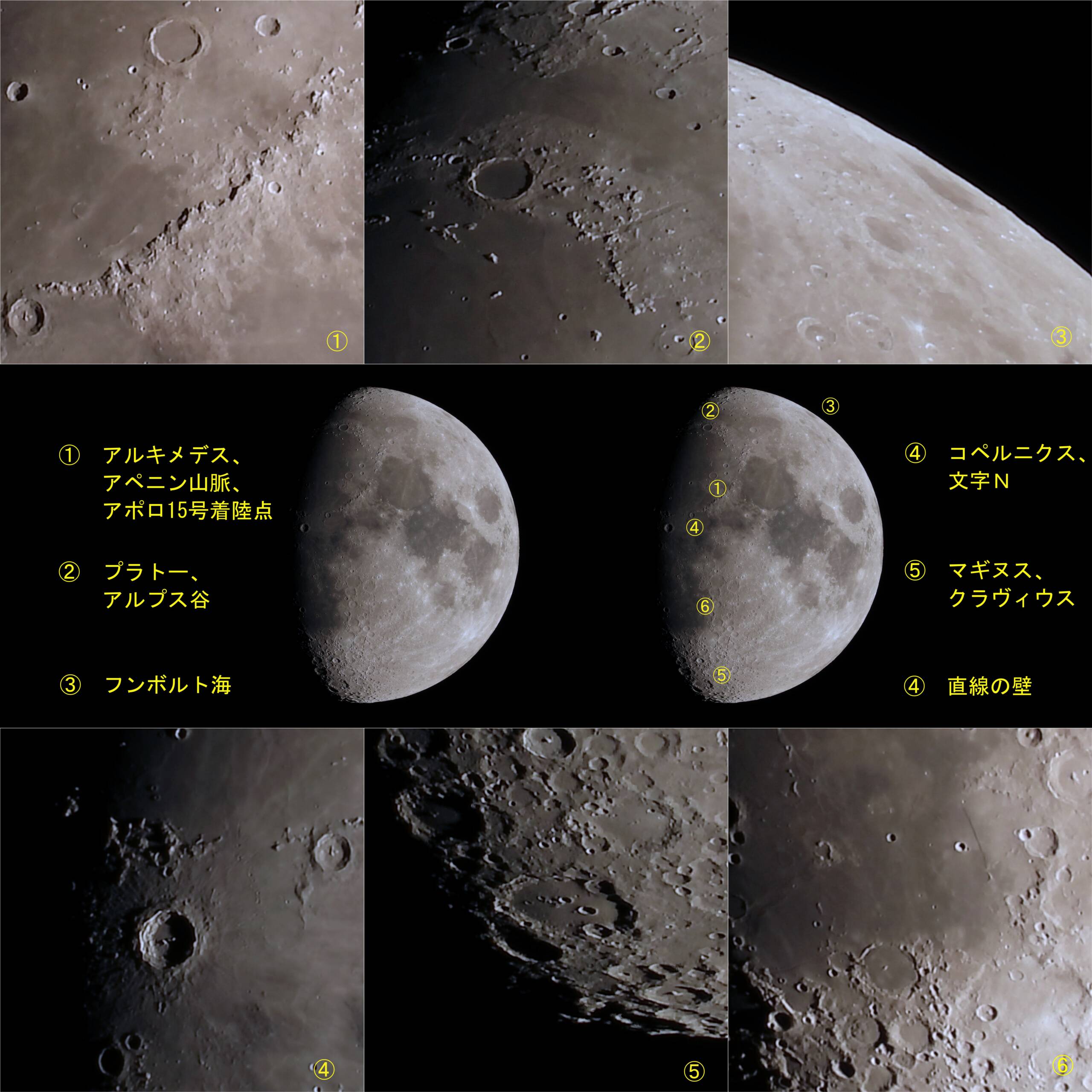 観察①はアペニン山脈、アポロ15号着地点を狙ったもの。②はいつも撮っているプラトー・クレーター、アルプス谷。プラトーは周辺クレーター内に影が見えていますが、山々の様子を想像すると面白い。先日Ray現象もあり、そんな点に注意するようになると楽しくなります。③は好きなフンボルト海、見えていて良かった。④はコペルニクス、夜が明けたばかりでクッキリとしていました。左上には”N”も見えています。⑤は昼間のマギヌスはどんな顔かと覗きましたが、魔女の面影も感じられません。Ray現象の面白さは貴重です。⑥は直線の壁、彫りが浅く見えますがそれとわかりますね。たったの10分近くの散歩というよりジョギングか、楽しい夕空の月でした。また撮りたい。