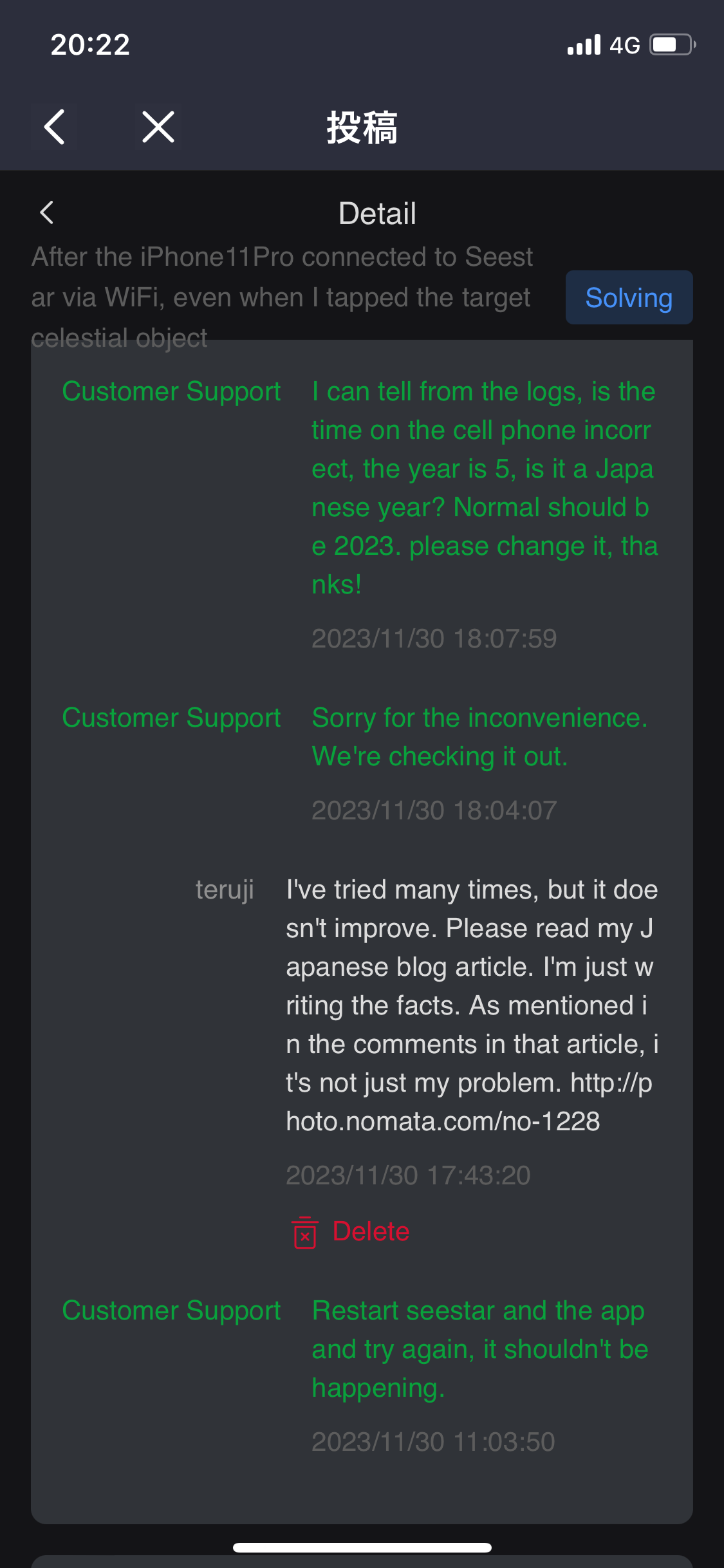 今回の不具合に関し、Seestarの製造元ZWO社とのバグ報告の交信を通し以下のとおり解決できましたので改めてここでまとめておきます。